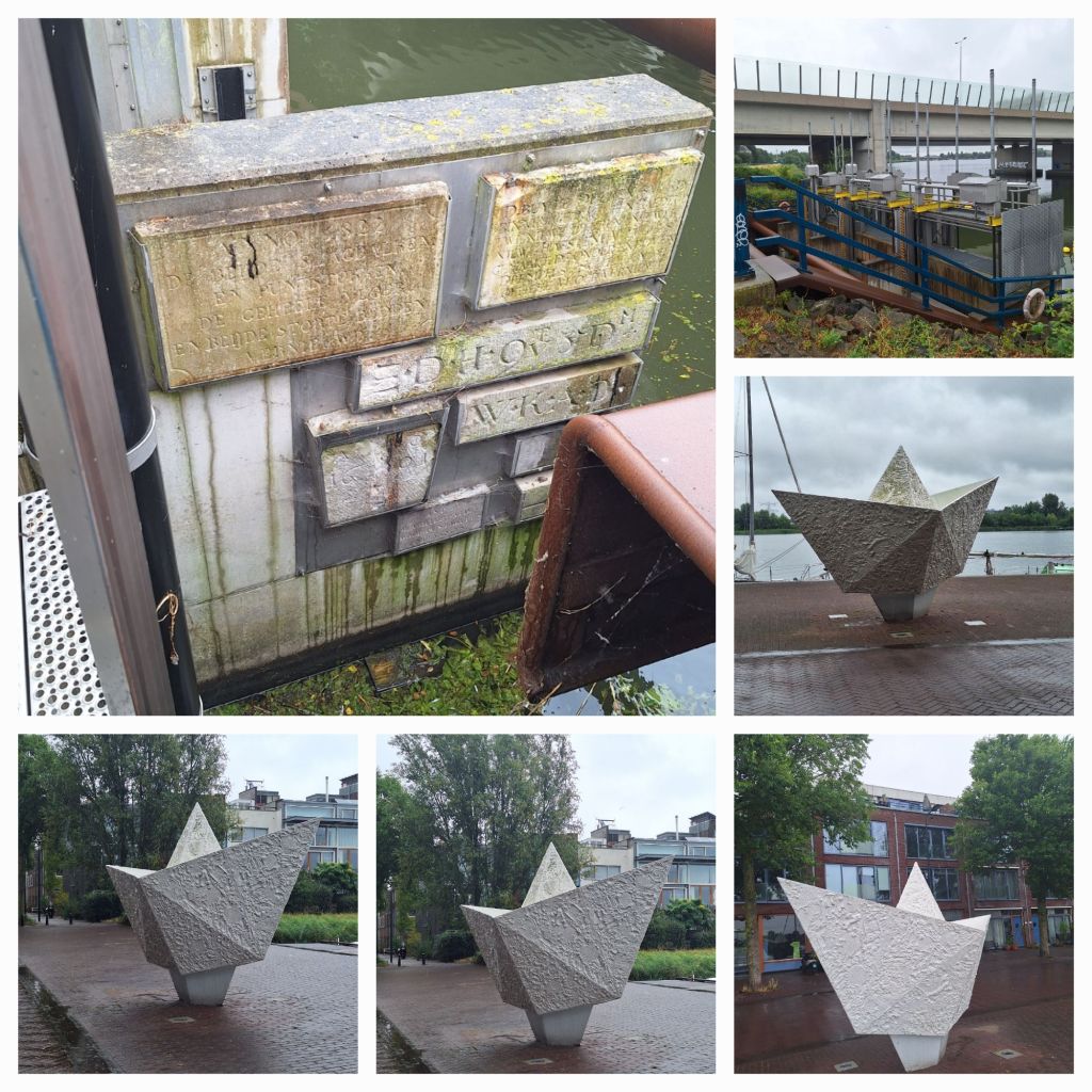 Over het Steigerland langs een beeld van een papieren vouwbootje loop ik naar de tram. Het is droog!