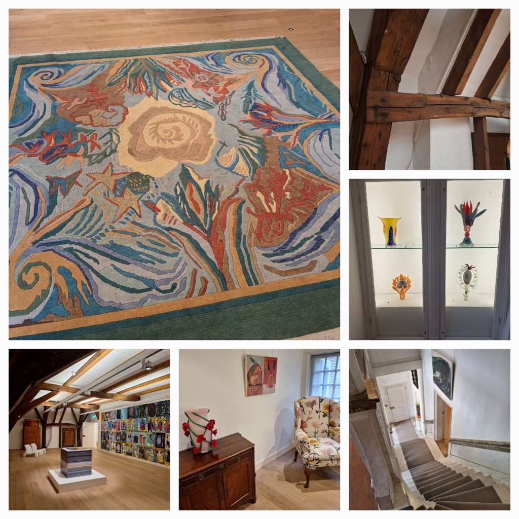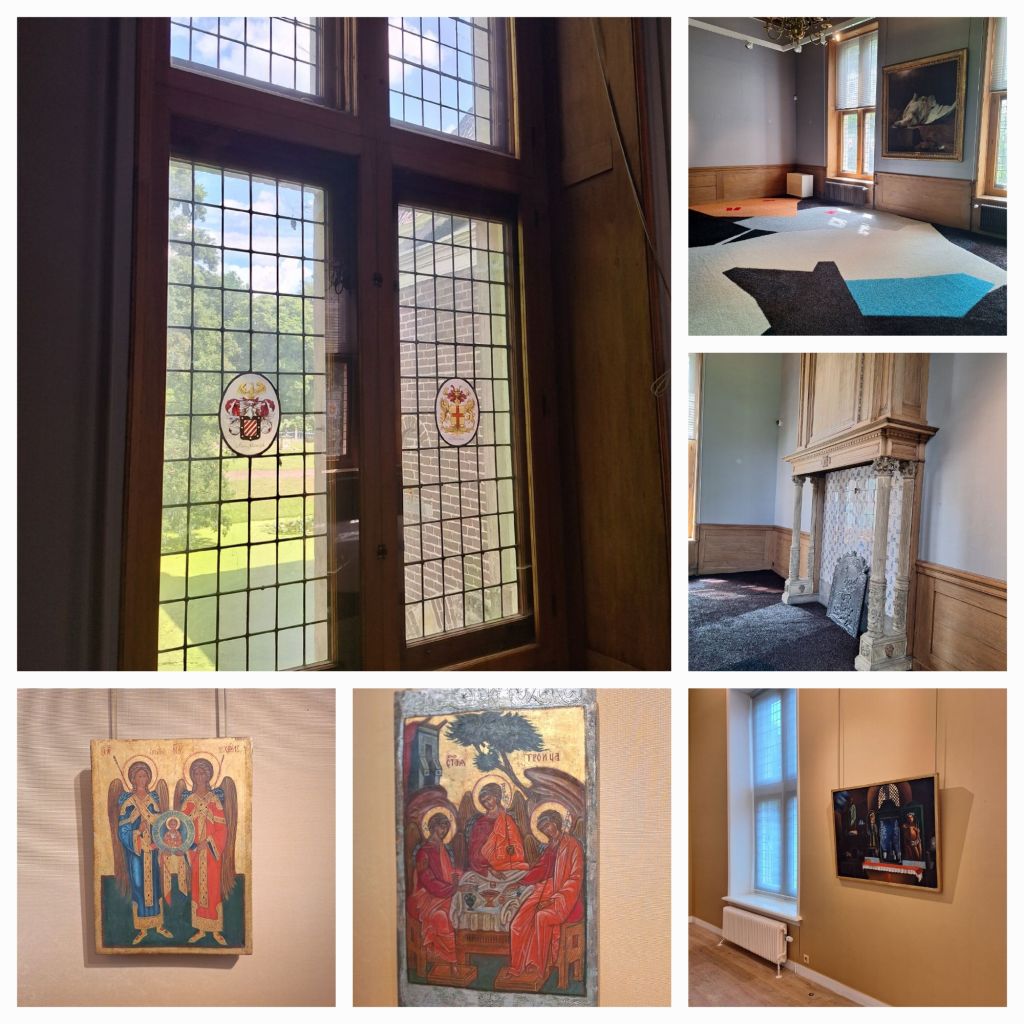 Ik mag door het kasteel lopen met een boekje met uitleg. Oud en nieuw staan en hangen bij elkaar. Middeleeuwse heiligenbeelden, een modern ‘tapijt’ van kunstgras, moderne glazen melkkannetjes, zilverwerk, een clavecymbel naast een modern beschilderde piano, het kan niet op.