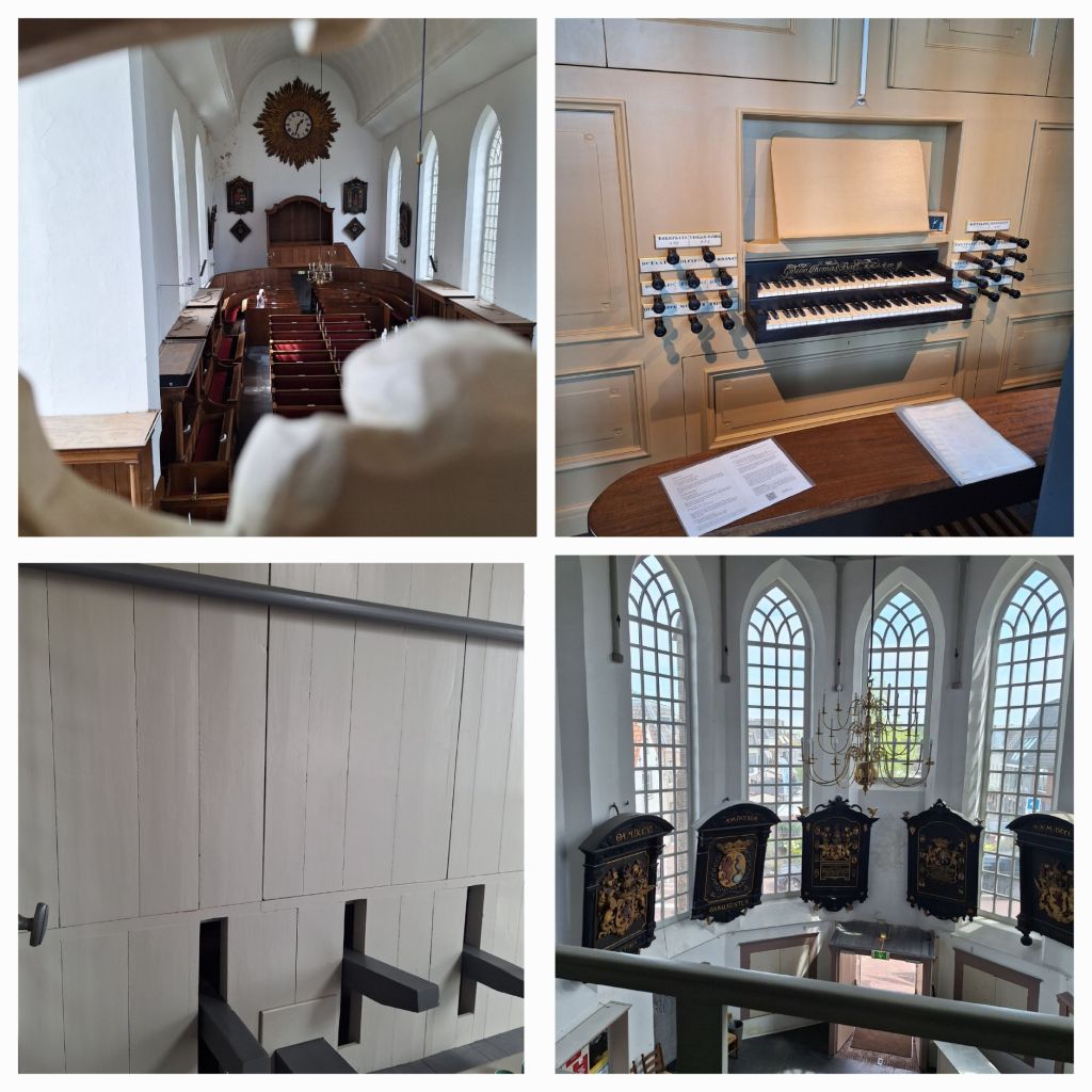 De organist, Ad van Pelt, heeft een leuk zomers programma in elkaar gezet dat bijna drie kwartier uur duurt. Op het positief (een klein pijporgel) begint hij met twee inventionen van Bach en daarna gaat hij de steile trap op naar het grote Bätz orgel uit 1787. Later klim ik die trap ook op, en dan zie ik balgtreden uit de grote houten kast steken. Het orgel kan dus ook met getreden wind worden bespeeld. Vandaag wordt dat niet gedaan.