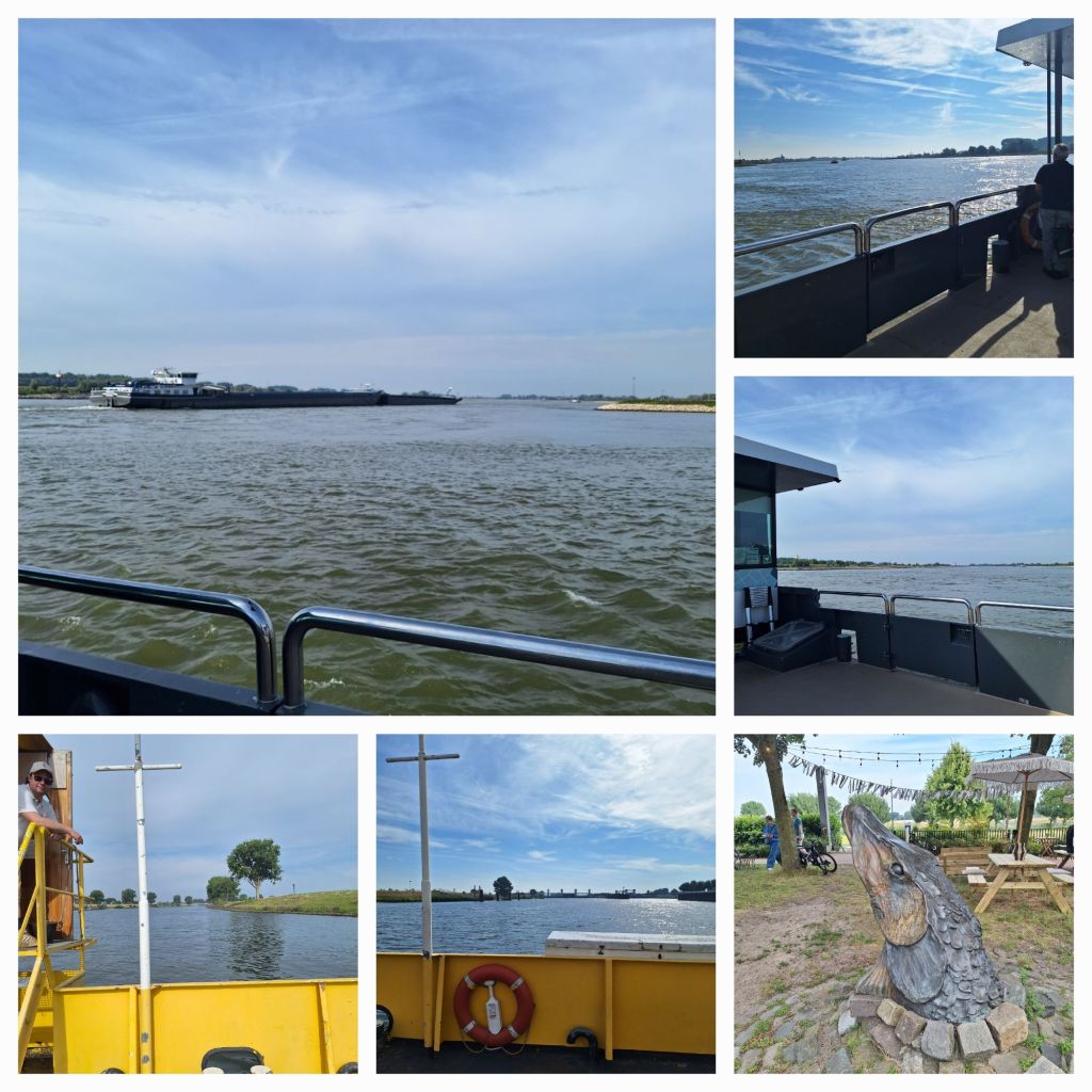 Vanaf huis ging ik naar de Waal om met de pont naar het Land van Maas en Waal over te steken. Over de dijken met de wind in de rug naar het punt waar de Heerewaardense Afsluitdijk begint en dan via de Meidijk naar de pont over de Maas naar Lith. Ik heb geluk. De pont zal bijna afvaren, maar de schipper vergat de ketting de lossen en toen hij mij zag fietsen, gingen de bomen nog even omhoog.