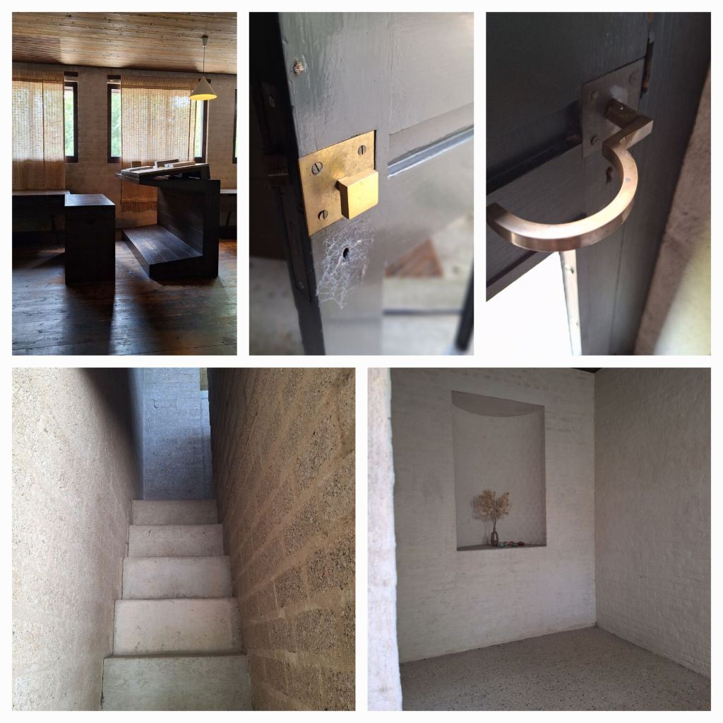 Maar dan stap ik de woonkamer binnen en dan begrijp ik het, tenminste dat denk ik. De ruimte staat rust en eenvoud uit. De pilaren vormen een soort galerij aan de noordkant. Waar ramen hadden kunnen zitten, hangen een soort rieten wandkleden. Aan de andere kant zijn een soort ‘cellen’ afgebakend door muurschijven met in het midden de ingang.