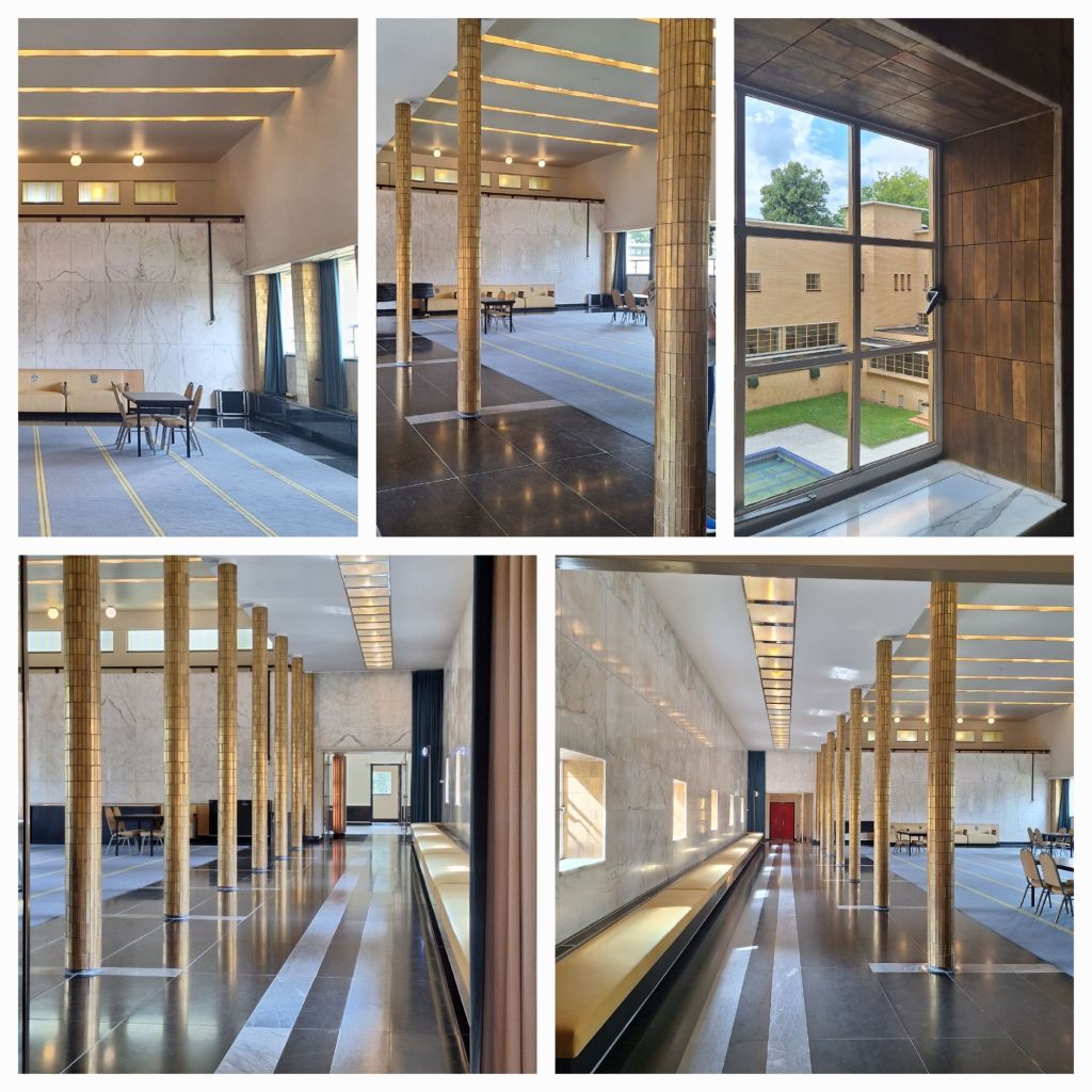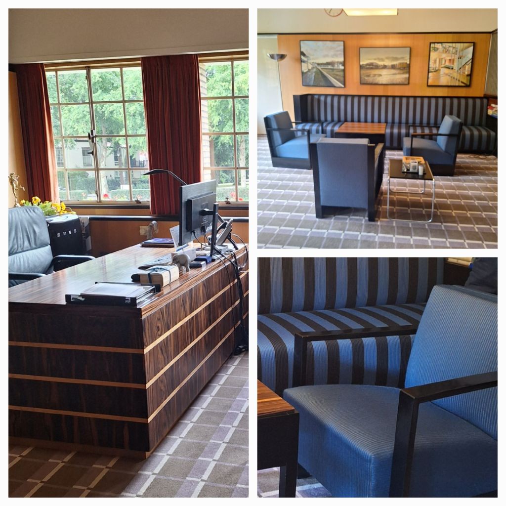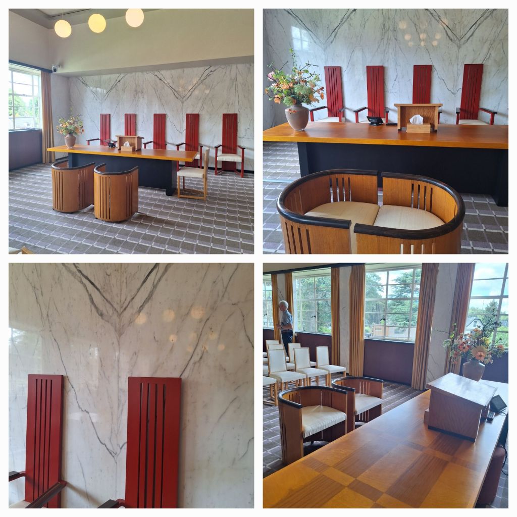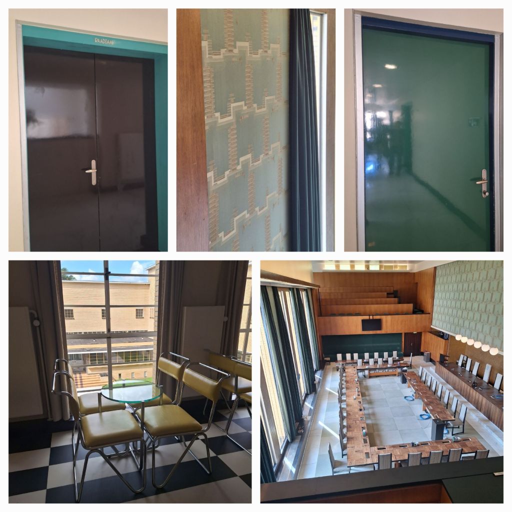We mogen in de kamer van de burgemeester kijken waar het hele ensemble van de hand van Dudok is, net als in de vergaderzaal van B&W. En idem in de raadzaal.