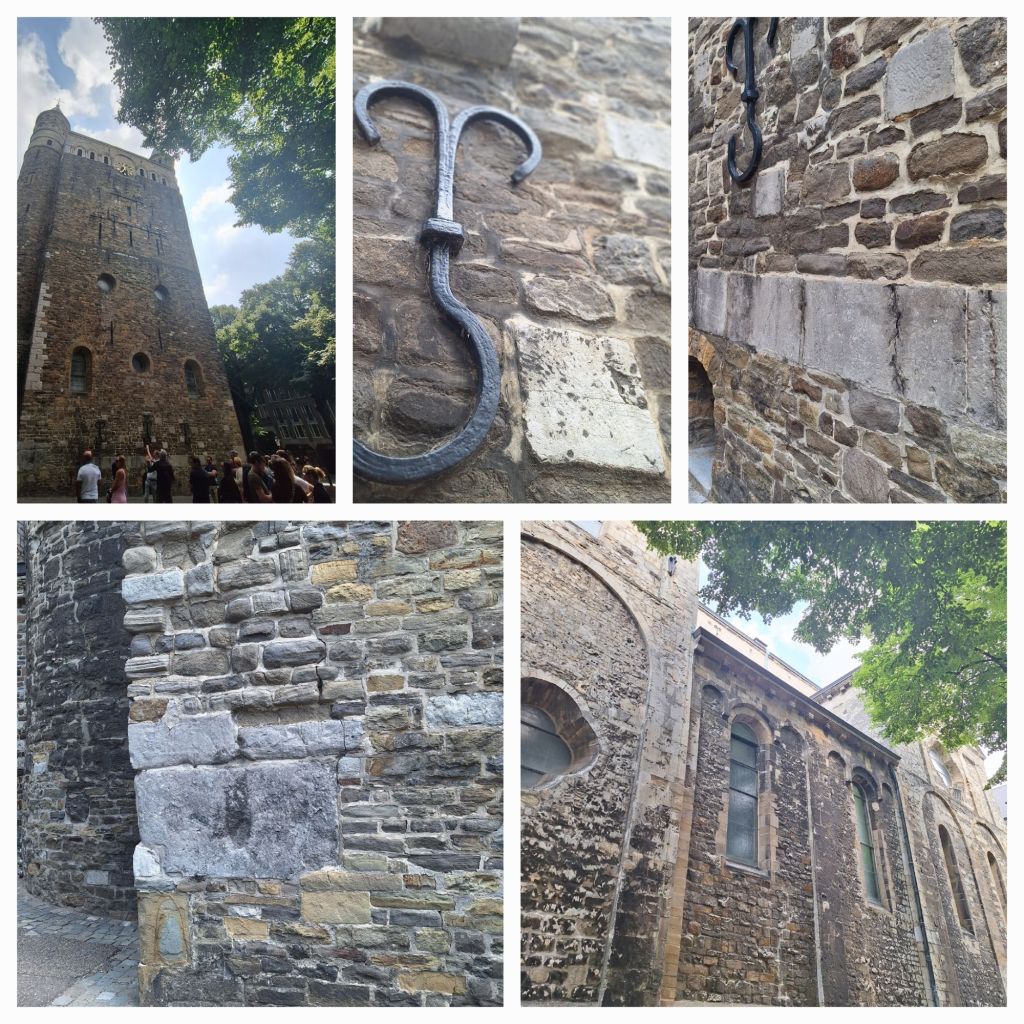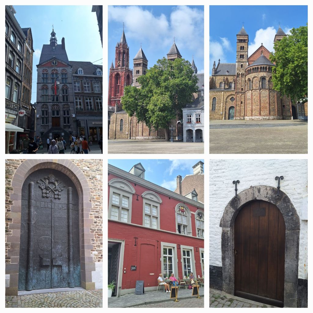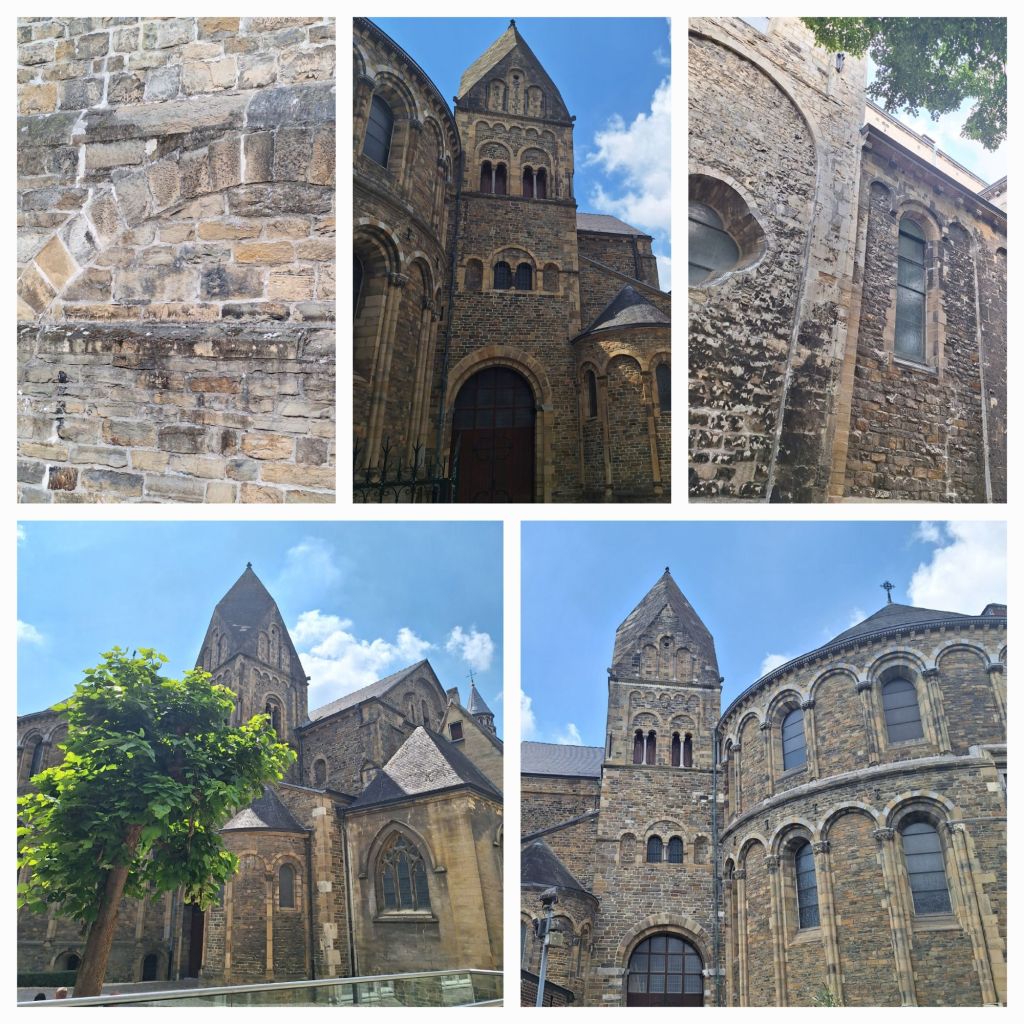 Ik ben op weg naar Slevrouwe, zoals de Maastrichtenaren haar noemen, de basiliek Onze Lieve Vrouw Sterre van de Zee. Deze kerk heeft een zeer imposant en massief westwerk met twee kleine ronde torens. De bouw werd ergens eind 10e eeuw aangevangen en het westwerk dateert uit die tijd. Op de hoeken zijn grote blokken grijze natuursteen te zien, spolia genaamd. Het zijn resten van een Romeinse poort die hier vanaf 333 stond en die bij de bouw van de kerk werd afgebroken.