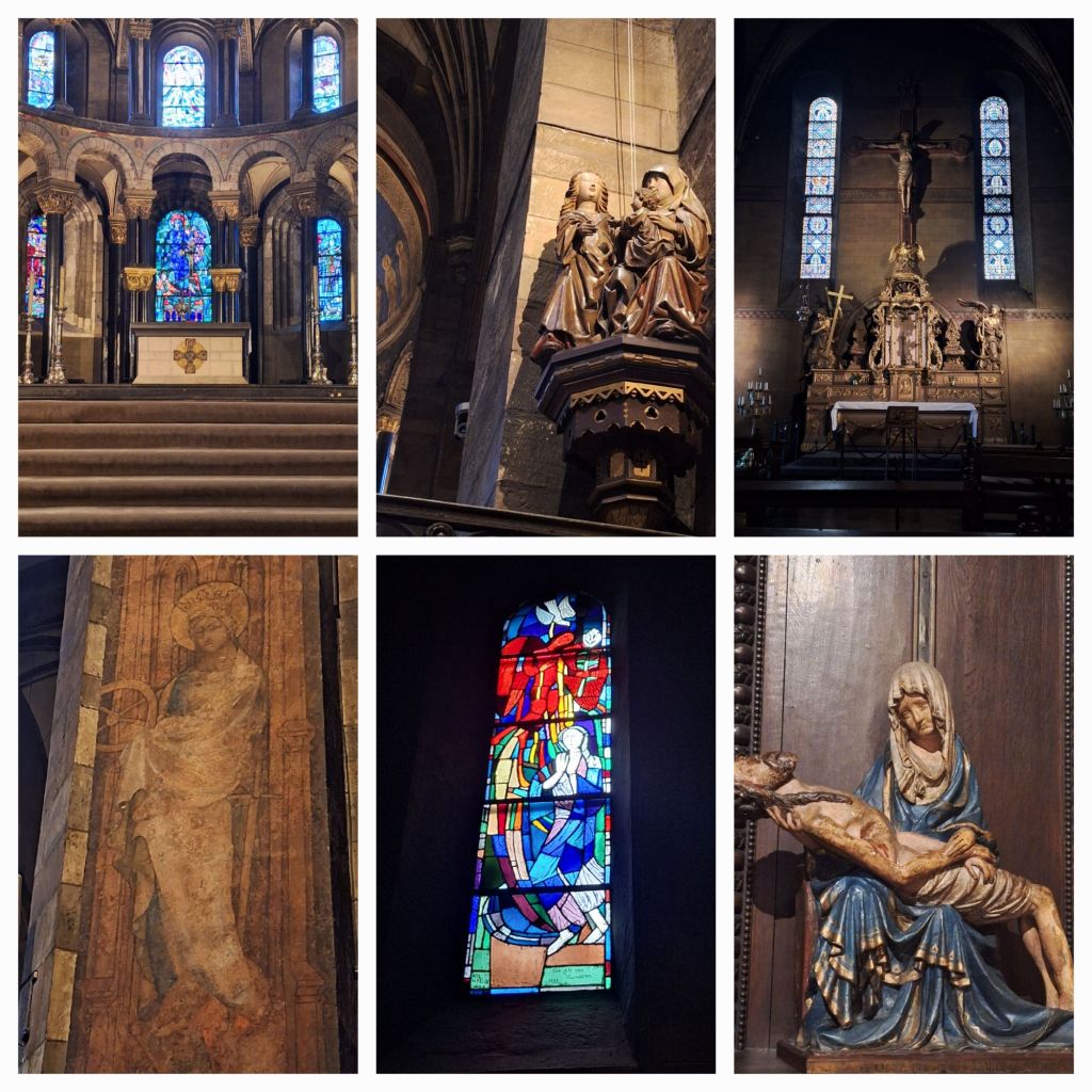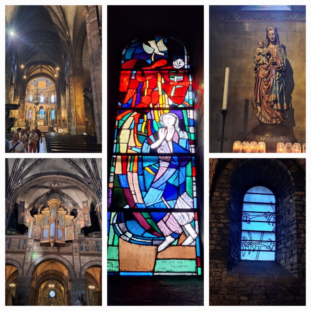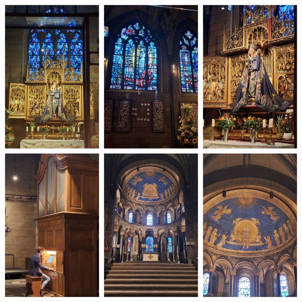 Het is een Romaanse kerk en de toegang is via de kapel van Onze Lieve Vrouwe. Honderden kaarsen branden en het 15e eeuwse beeld van Maria met Jezus is gehuld in een donkerblauwe mantel met rode bloemen. Dan ga ik de kerk binnen. Het duurt even voor ik wen aan de donkerte in de kerk, ondanks de felle spotjes overal. Het is een mystieke kerk, donker met kleine rondboogramen met prachtige glas-in-loodramen. De apsis achter het altaar is blauw met goud geschilderd. Veel is nieuw, tenminste uit de tijd van Cuypers, maar dat versterkt de mystieke sfeer alleen maar.