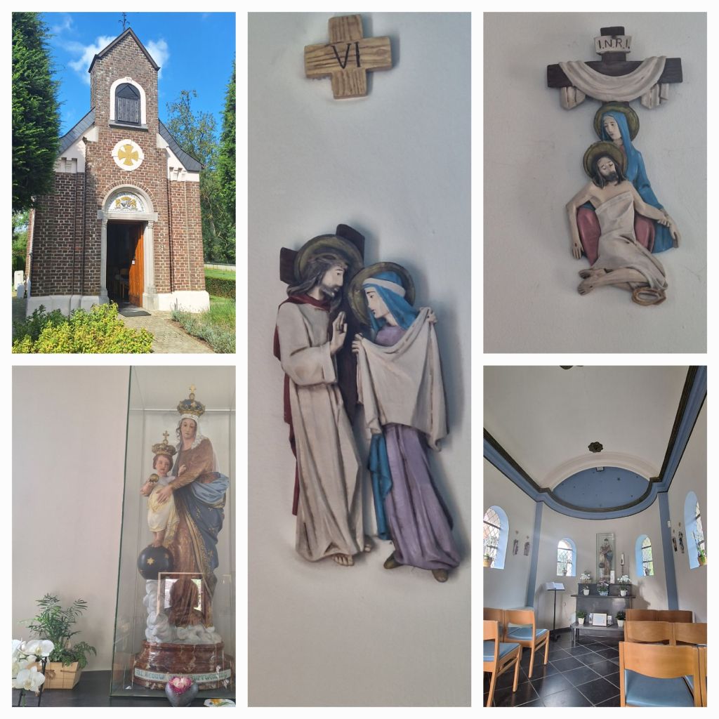 Bij Mazenhoven staat een kleine kapel, de Onze Lieve Vrouw van Overwinning, Deze neo-romaanse kapel werd in 1894 gebouwd in opdracht van de dochters van de burggraaf van Leut, Charles Vilain XIIII. Ik ga even naar binnen. Het heeft een heel aparte kruiswegstatie, kleine losse beeldjes aan de muur bevestigd.