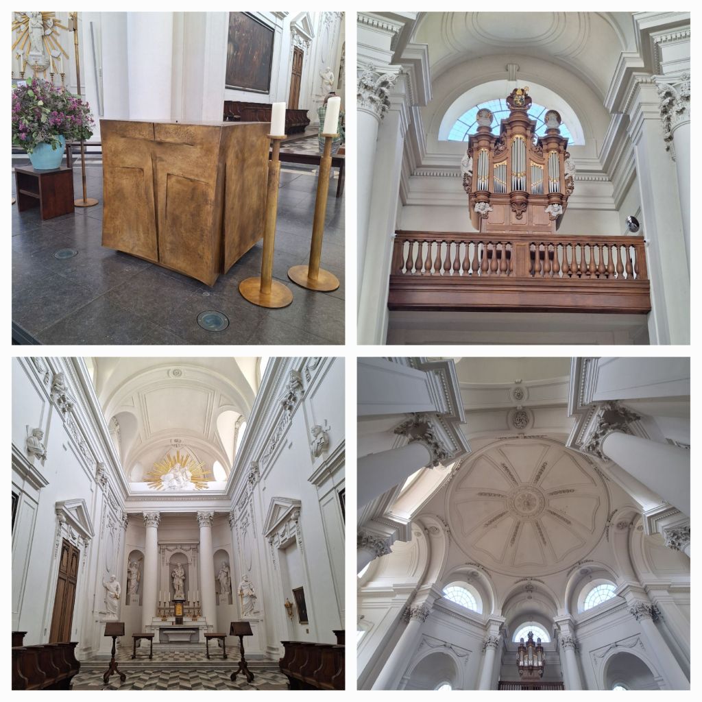 Het grijze en strenge uiterlijk van de kerk valt helemaal weg, als ik binnenstap. Alles is wit en rond. Ovale ramen, wit stukwerk, een grote witte vieringkoepel. Duidelijk is te zien dat de kerk is ingericht voor een kloostergemeenschap. Het koor is heel groot en van een schip is geen sprake. Het transept is gelijk ook het schipgedeelte. Maar we komen natuurlijk voor het orgel.