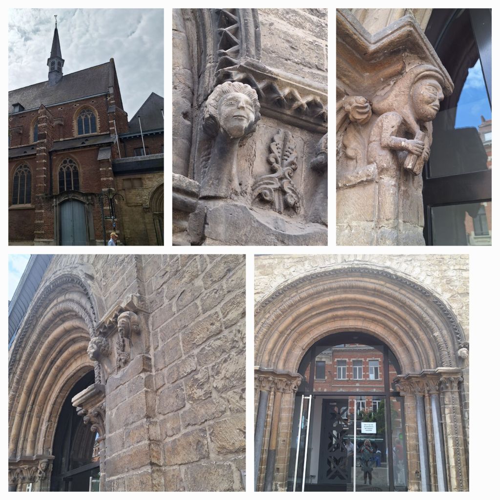 Tijd om de bus op te zoeken, die pal voor de kerk blijkt te staan. De oude poort was dus breed genoeg! Op naar hartje Leuven. We worden verwacht bij Kapel de Romaanse Poort. Ik wist niet goed wat te verwachten, maar het blijkt dat we bij het cultureel centrum van Leuven zijn, een merkwaardig gebouwencompex met een moderne concertzaal vastgeplakt aan de 15e eeuwse kapel van het Elisabeth Gasthuis dat hier ooit stond. Van het in oorsprong 11e eeuwse gasthuis rest naast de kapel alleen nog de Romaanse Poort uit 1218-1222, nu de toegangspoort van het Cultureel Centrum.