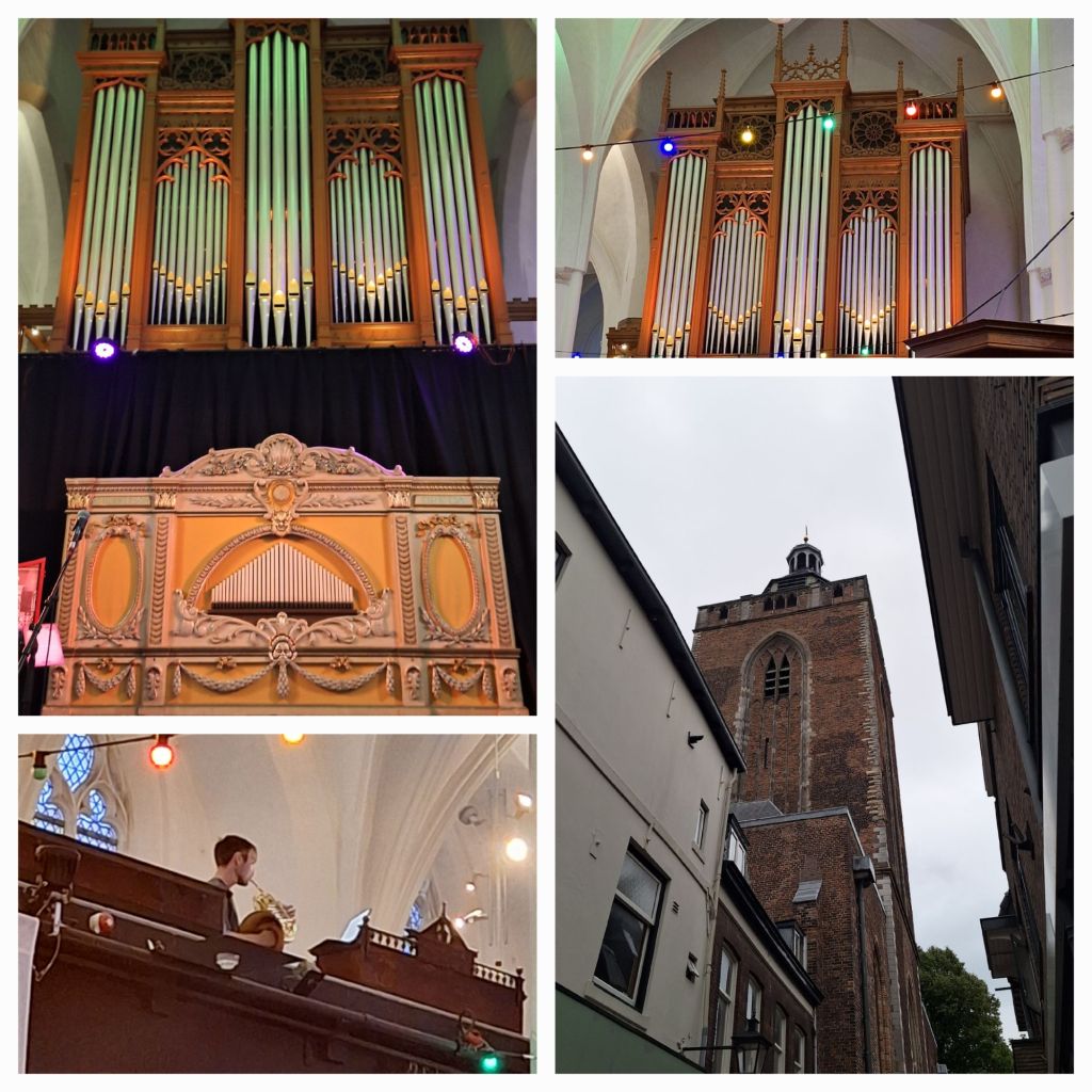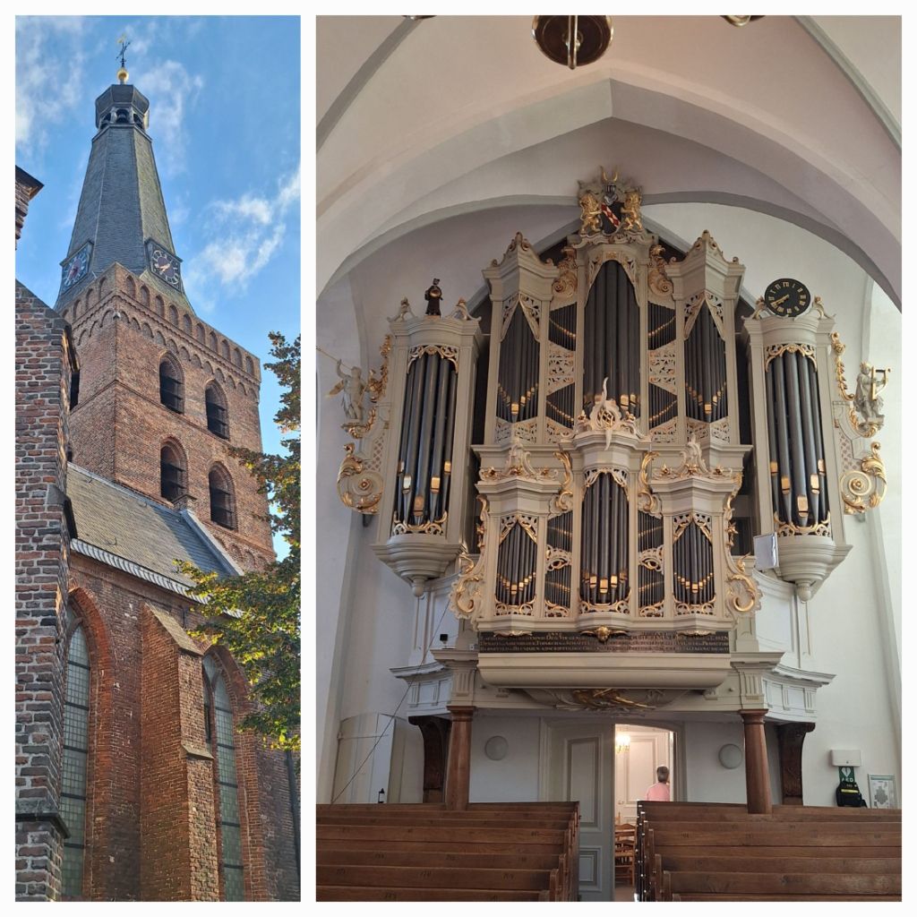 Ik ben altijd weer verrast als ik deze grote kerk binnenstap. Het doet licht en vrolijk aan. De enorm hoge gewelven zijn voorzien van prachtige bloemmotieven, ergens in een pilaar is een kogel ingemetseld met het jaartal 1594 en als je je omdraait hangt daar, glimmend als altijd, het grote orgel.