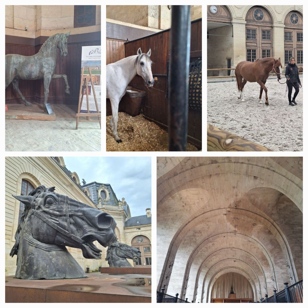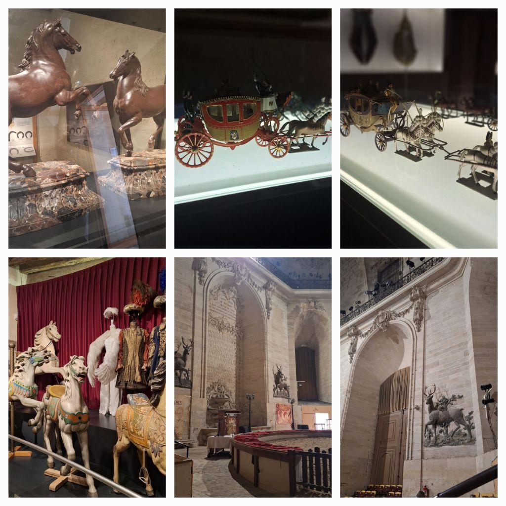 En dan is de beurt aan de stallen. Zou het wat zijn? We hadden al paarden gezien in het park en het blijkt dat de stallen inderdaad echt nog stallen zijn. Er zijn paarden, ezels, een muilezel en diverse pony’s en dat ruik je ook. De koetsenstallingen zijn omgetoverd tot een museum over het paard in samenhang met de mens en is de moeite echt waard. Op de binnenplaats staat een paar immense paardenhoofden. Sowieso zijn er overal afbeeldingen van paarden te zien.