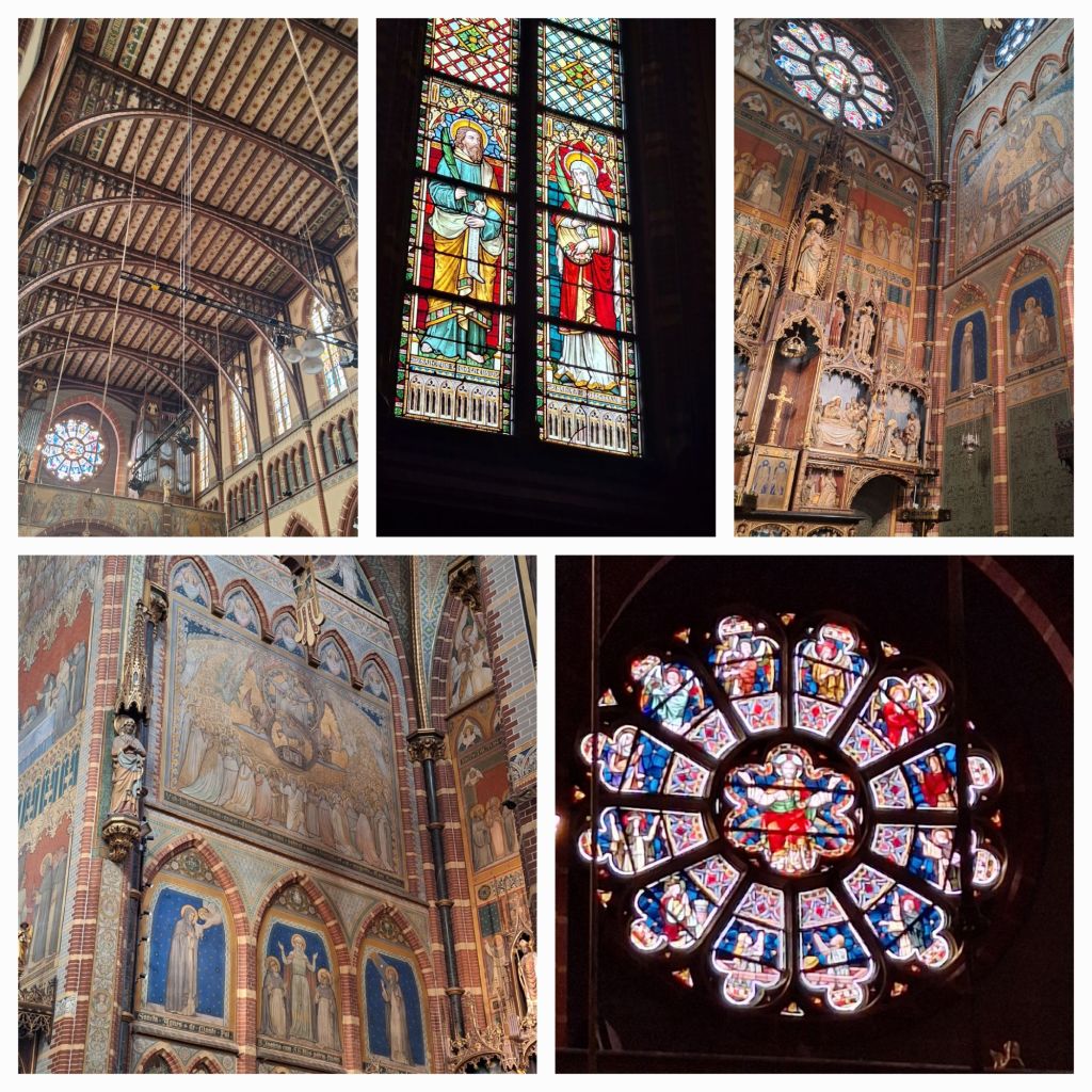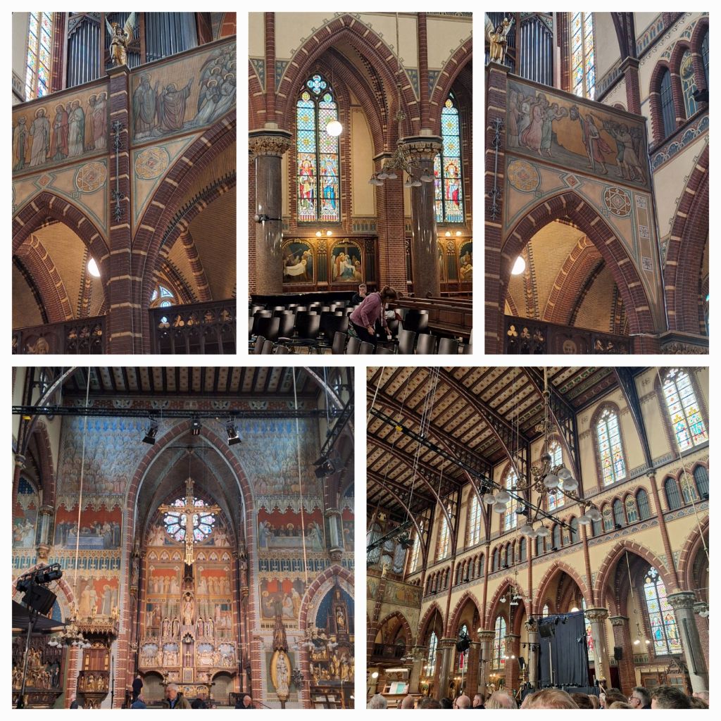 Eenmaal binnen geloof je niet dat de kerk op een vrij klein perceel gebouwd is. Het oogt licht en luchtig en hoog. De kerk is prachtig versierd, als het Gesamtkunstwerk dat Cuypers voor ogen had. Ook de orgelkas, aan weerszijden van het roosvenster, is van zijn hand. De binnenkant uiteraard niet. Dat is van de hand van orgelbouwer P. Adema, een symfonisch orgel. De speeltafel staat midden in de kerk en ik zoek een mooi plekje uit.