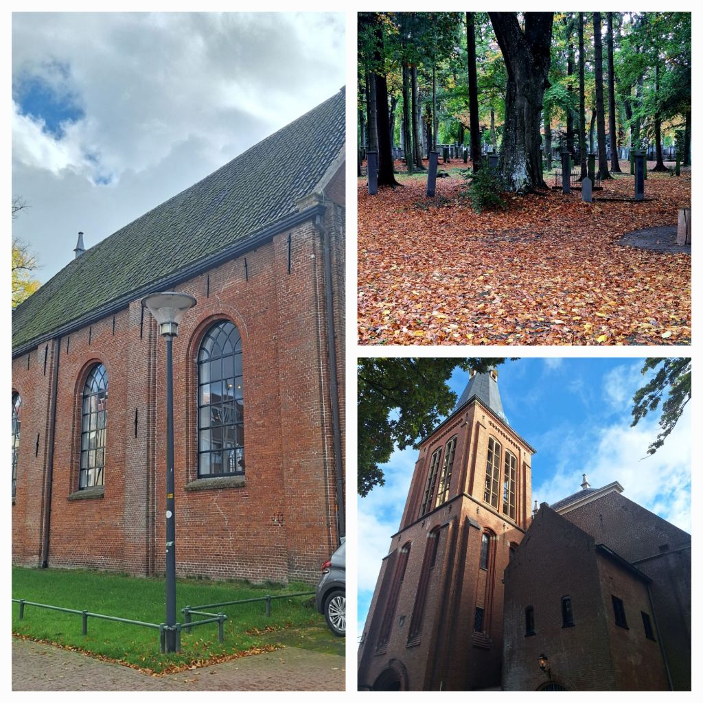 Als we uitstappen bij het fraaie smeedijzeren hek valt er een beetje regen, maar het waait ook even flink. En dat zorgt voor prachtige aanblik van de kerk en de naastgelegen 18e eeuwse pastorie. Aan het eind van de Kerksingel, omzoomd door bomen en bezaaid met goudkleurig blad, zien we de kerk al staan.
