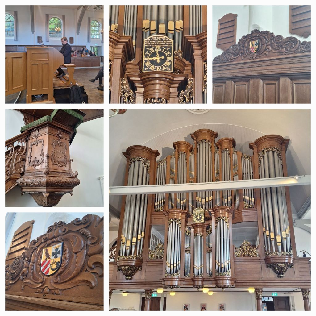 Sietze vertelt ons na de koffie iets over het orgel. Het uiterlijk is nl bedrieglijk. De kas is van Timpe die 1824 het orgel leverde. Dat is nog in 1847 door Van Oeckelen aangepast maar begin 20e eeuw is het hele binnenwerk compleet vervangen door een Faber & Dienes orgel. Een concertorgel. Waarom? Wel, Veendam had een nieuwe organist in dienst die uit Berlijn kwam. Hij was als cantor-organist uit de Duitse traditie minder vertrouwd met gemeentezang (waarop Nederlandse orgels werden ingericht). Hij wilde een orgel waarmee ook concerten met orkest konden worden gegeven. Het orgel is vanaf 2019 gereconstrueerd naar de situatie van 1928. De nu digitaal aangestuurde speeltafel (ontwerp van Albert Schweitzer) lijkt wel een soort cockpit met metertjes en mooi gekleurde knoppen.