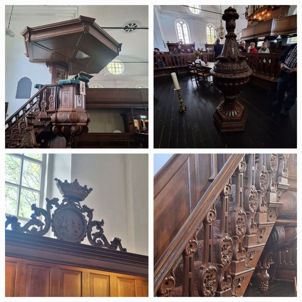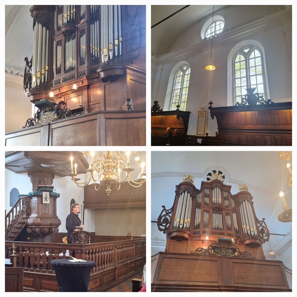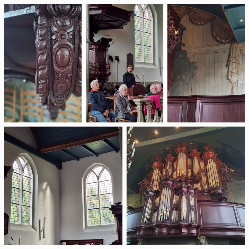 Maar we komen voor het orgel. Midden 17e eeuw is op de dam een kerk gebouwd die midden 18e eeuw is uitgebreid. Als we de kerkzaal inlopen is dat van binnen niet te zien. Alles is wit gepleisterd. Opvallend zijn de grote schippersbanken aan weerszijden en pontificaal voor het liturgisch centrum de orgelspeeltafel.