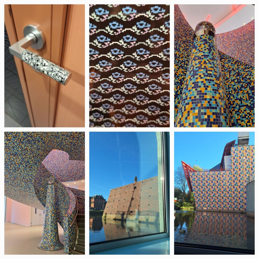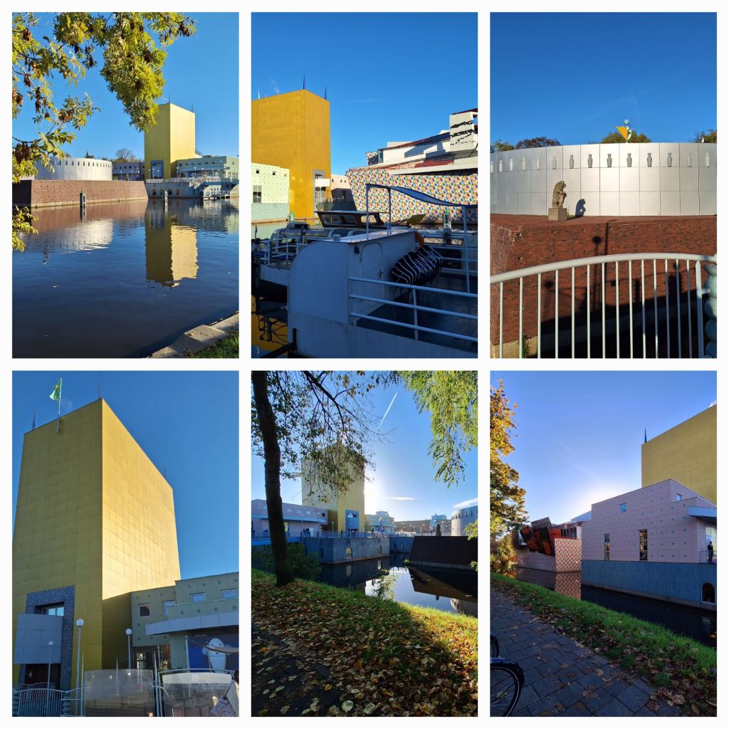 Recht tegenover het station staat het schitterende museumgebouw, op een eiland in de zwaaikom van het Verbindingskanaal. Het is een ratjetoe van stijlen en dat komt omdat de hoofdarchitect diverse collega’s de paviljoens liet ontwerpen. Het is kleurrijk, met de goudgele depottoren, het roestig uitziende paviljoen in deconstructivistische stijl, een paviljoen dat op een vestingwerk lijkt en een grote grijze cilinder. Binnen is het al net zo kleurig en afwisselend. Ik word blij van dit museum.