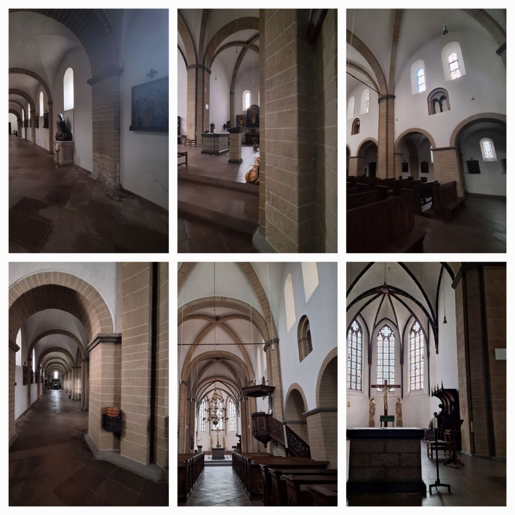 Het is een grote voormalige kloosterkerk, opgetrokken uit tufsteen, met een groot oostwerk in plaats van een westwerk. Ik loop het kerkhof op en langs de graven ga ik naar de westkant, waar de deur open is. Het kleine bordje boven de deurklink laat me weten dat ik goed moet doorduwen, omdat de deur lastig opent en sluit.