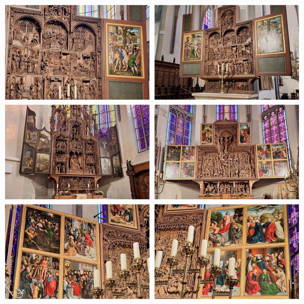 Ik loop door de kerk m.b.v. de website met een virtuele tour. Bij ieder altaar krijg ik zo meer te horen over de ontstaansgeschiedenis, de makers en de opdrachtgevers. De altaren stammen uit de 15e en 16e eeuw. Sommige zijn beschilderd, de meesten bestaan uit een middendeel met beelden en houtsnijwerk, maar de meeste bijzondere zijn het Sint Jorisaltaar, het Zeven smartenaltaar en het Hoogaltaar. Hier is houtsnijwerk tot zeer grote hoogten gevoerd. Wat een kunstwerken zijn dit!