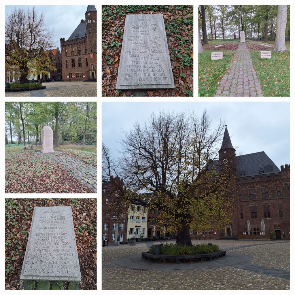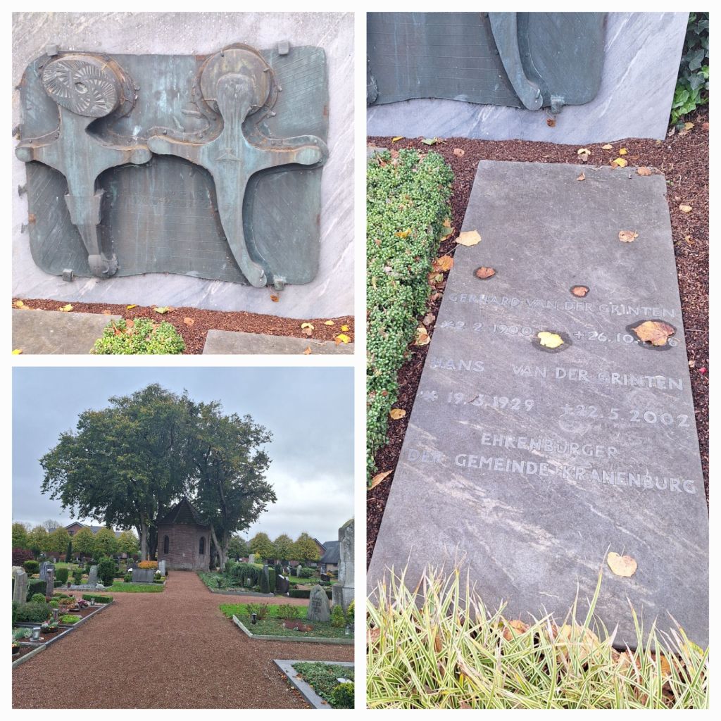 In Kranenburg ga ik even pauzeren. Ik heb de helft van de tocht afgelegd en wil graag nog even naar de begraafplaats. Gisteren in het Schloß Moyland las ik dat twee van de oprichters van het museum hier begraven liggen: de gebroeders Van der Grinten. Franz Joseph was dichter, beeldend kunstenaar, kunstverzamelaar, en museumdirecteur van Museum Schloss Moyland, Hans was kunstverzamelaar, conservator, museumdirecteur, schrijver en beeldend kunstenaar. Ze kochten veel kunst aan van Joseph Beuys en hij ontwierp voor hen een grafmonument na het overlijden van hun ouders. Het is een bronzen kopie van de beide eikenhouten Christusbeelden die in het museum te zien zijn, links de gekruisigde Christus, rechts de opgestane Christus.