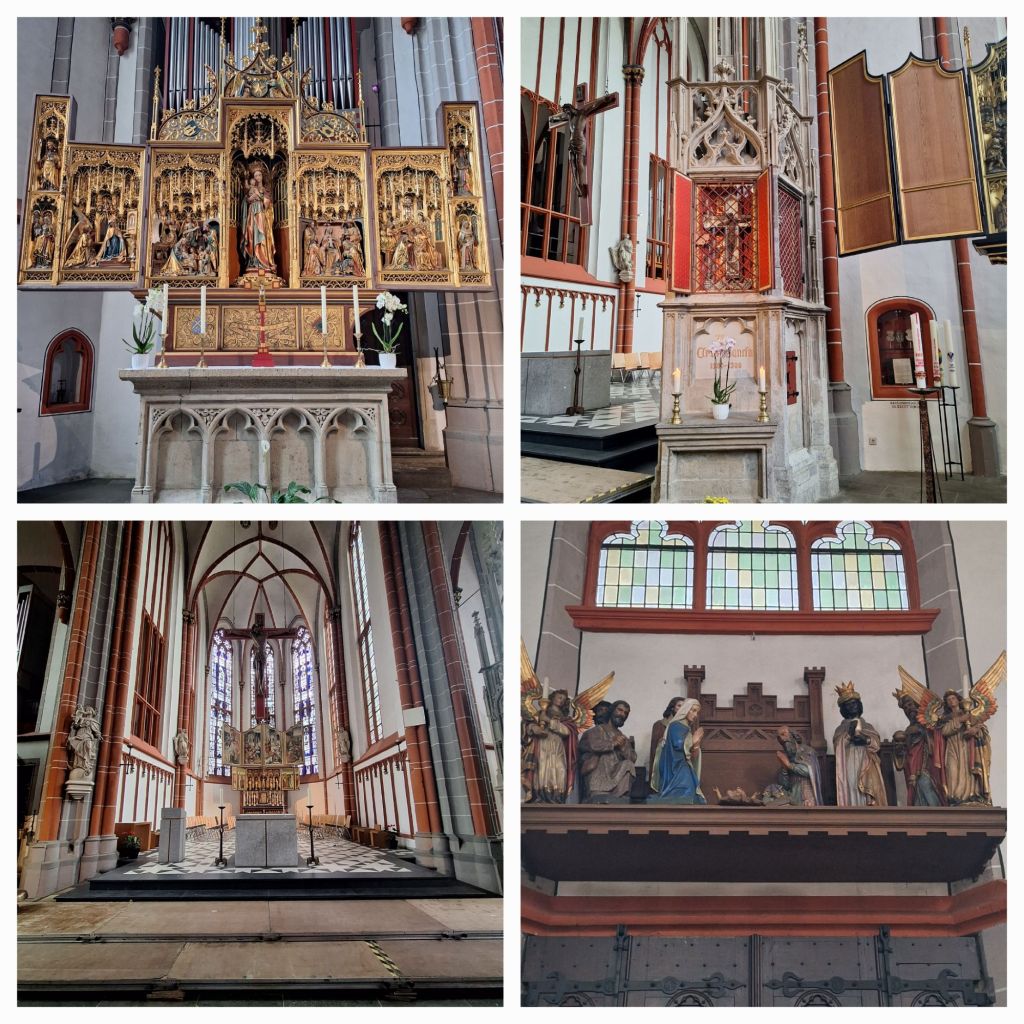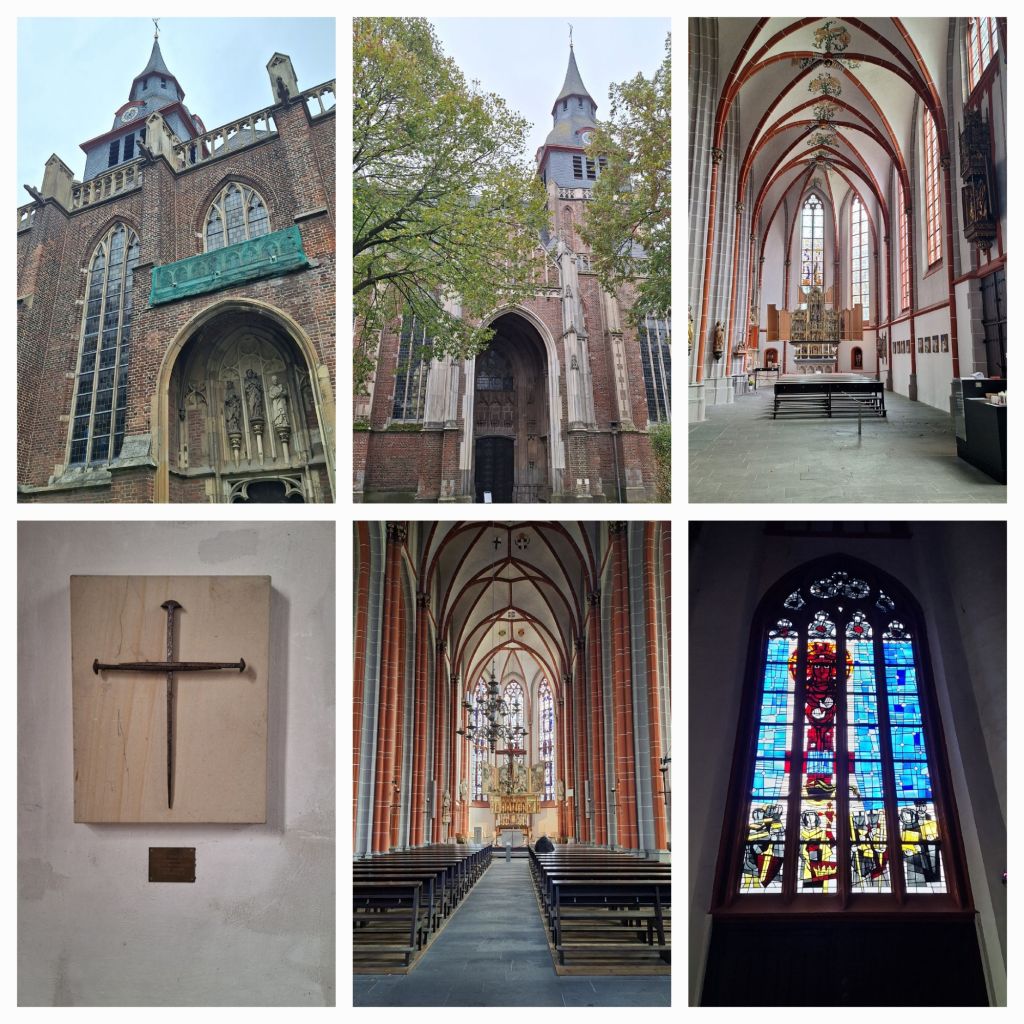 Achter de konditorei staat een ogenschijnlijk 19e eeuwse kerk, maar schijn bedriegt. Het is de Sint Peter en Sint Paulus kerk uit de 15e eeuw. In de voorgangers van de kerk en ook in deze kerk wordt sinds 1308 het wonderbaarlijk kruis aanbeden. Dit is weer zo’n mooi verhaal. In 1338 werd het volgende opgetekend: Met Pasen 1280 lukte het een herder niet om een geconsacreerde hostie door te slikken. Hij spuugde het uit in de spleet van een boom in het Reichswald. De herder biechtte zijn zonde op aan de priester die onmiddellijk ging zoeken maar de hostie niet vond.
