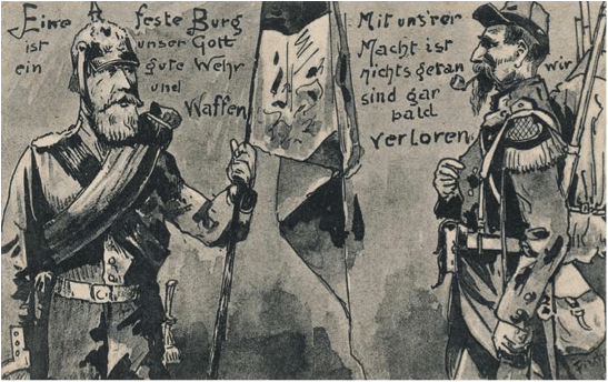 Smelik laat ons een voorbeeld zien van een Duitse kaart uit de Eerste Wereldoorlog, waarbij ‘Ein feste Burg is unser Gott’ als propaganda wordt gebruikt.