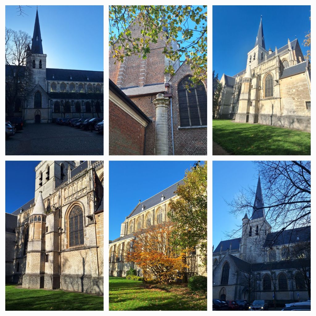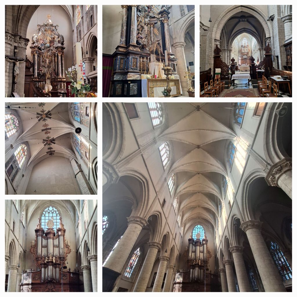 Na koffie met verrukkelijke Belgische lekkernijen -ik heb er wel drie gegeten, erg, hè?- gaan we naar de eerste concertlokatie van vandaag: de Sint-Waldetrudiskerk. De felle zon zorgt ervoor dat de noordkant van de kerk bijna niet te zien is. De zuidkant staat fel in het licht. De 14e eeuwse toren met een hoge spits staat op een merkwaardige plek, nl. tussen koor en beuk, op de plek waar normaal de vieringtoren staat. De kerk is ook niet afgebouwd, want het koor eindigt abrupt in een rechte wand.