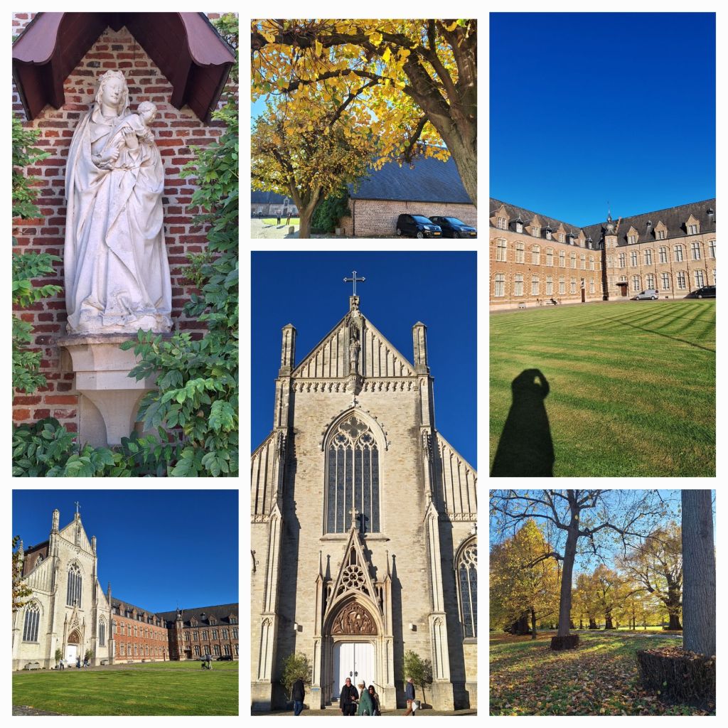 Wanneer we over het Geneinde in Tongerlo rijden staat links van ons de abdij in het zonlicht te stralen. Vanaf het parkeerterrein lopen we de 14e eeuwse poort door naar het binnenterrein waar de 19e eeuwse kerk in witgrijze steen scherp afsteekt tegen de bakstenen gebouwen. Onze volgende bestemming!