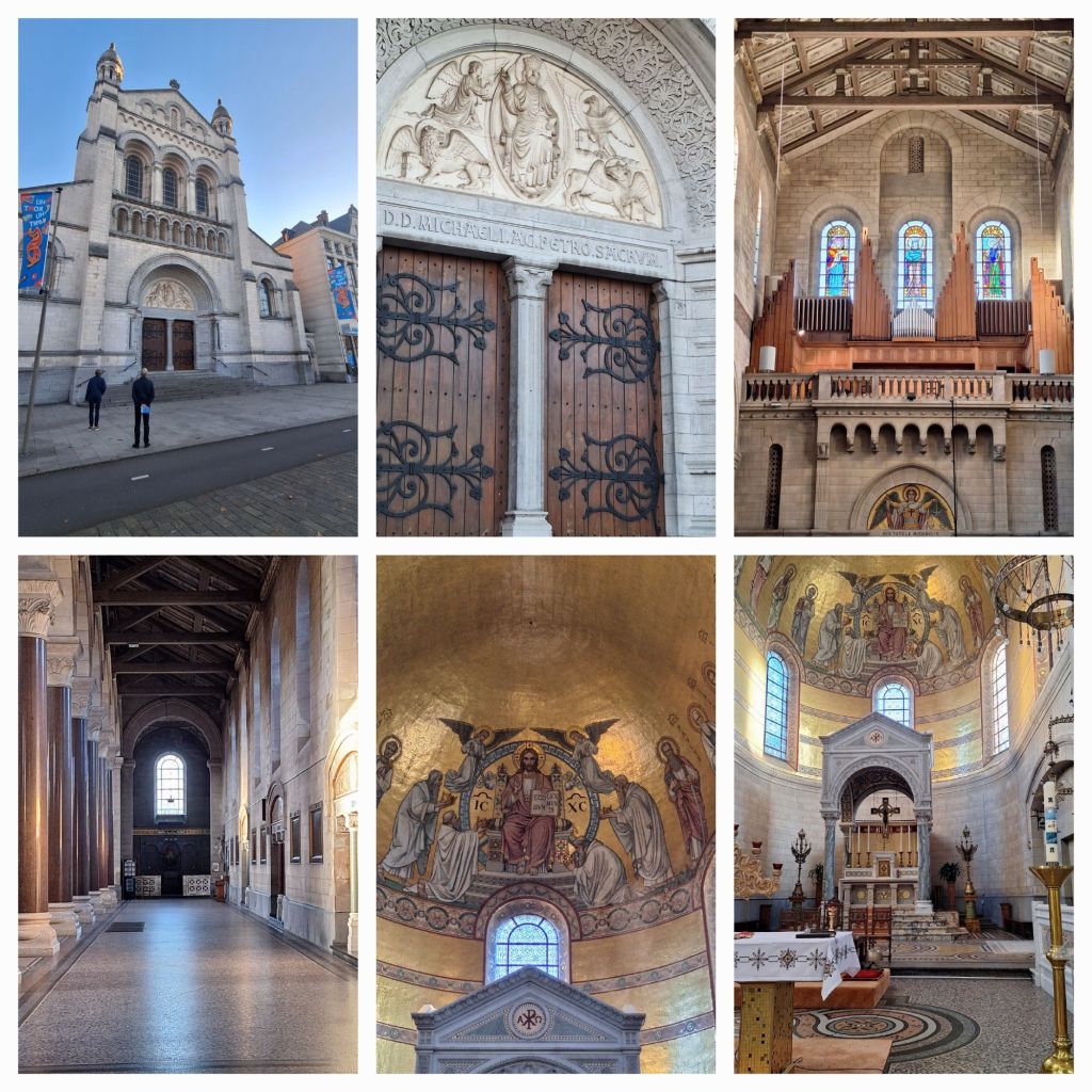 Vlakbij de Sint-Michiel en Sint-Pieter stappen we uit. Deze kerk is in 1897 is gebruik genomen in een stuk van Antwerpen dat destijds werd ontwikkeld. Overal werden neogotische kerken gebouwd en het stadsbestuur vond dat in deze wijk maar eens wat anders moest komen. Zo gezegd, zo gedaan. Men trok op studiereis naar o.a. Parijs en daar bezocht men de Saint-Pierre de Montmartre, een 12e eeuwse Romaanse kerk en deze kerk werd het voorbeeld voor deze Antwerpse parochiekerk.