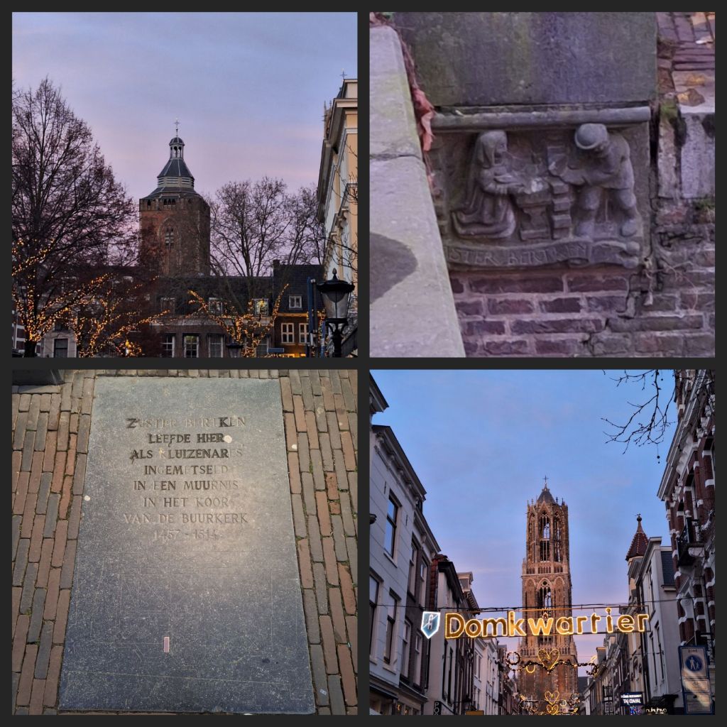 Ik ben vanmiddag naar Utrecht afgereisd en ga een paar plekken langs die met Bertha te maken hebben. Of met Suster Bertken, zoals ze beter bekend staat. Op de Maartensbrug –de oudste brug over de Oude Gracht (de eerste vermelding van een brug is uit 1196)– staan lantaarnpalen en de console van één zo’n paal heeft een modern beeldhouwwerkje van het moment van inkluizing. Twee mannen sluiten de kluis, terwijl Bertken knielt met een boek op de lessenaar.