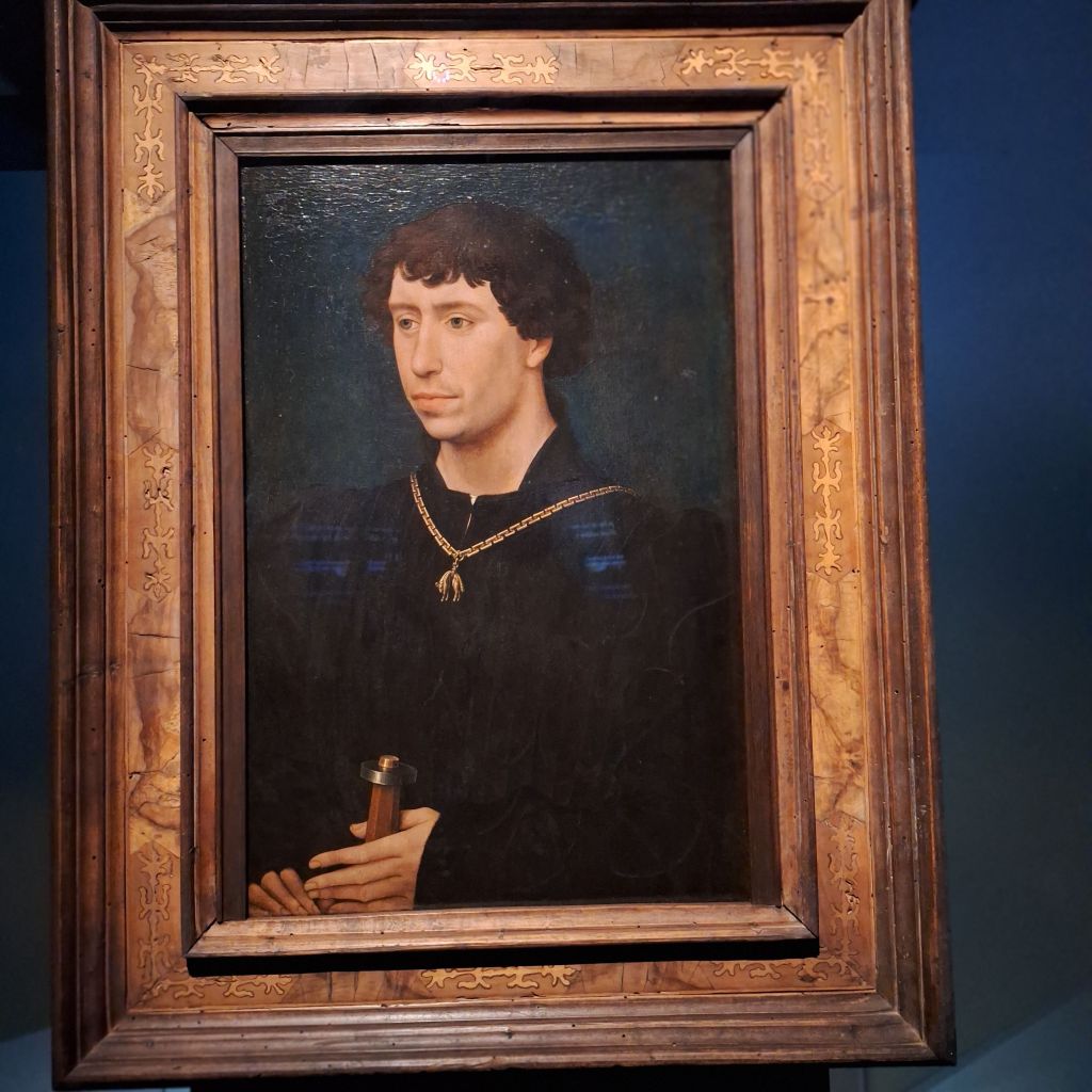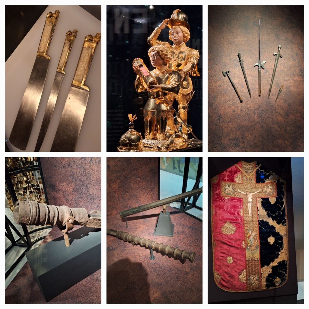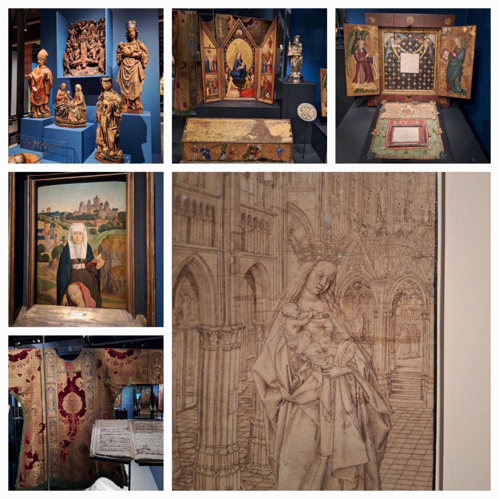 In de tentoonstelling zie ik een schilderij van de belegering van Neuss: Karel zeulde heel wat mee in zijn legertros, waaronder kunstschatten en prachtige tenten. Het beleg van Neuss liep op niets uit en Karel moest alles achterlaten. Van zijn tent zou een kazuifel gemaakt zijn, een priestergewaad.