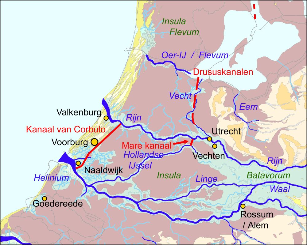 Archeoloog Jan Verhagen is een aantal jaren geleden gepromoveerd op deze kanalen en zijn proefschrift heeft de naam ‘Tussen de Dam van Drusus en de Zuilen van Hercules’.