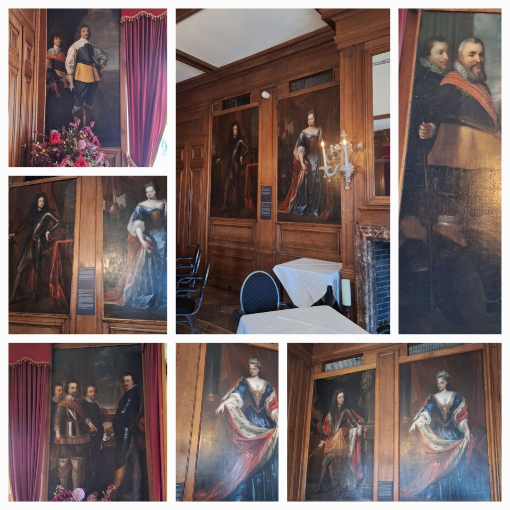 En we zijn weer terug in onze tijd. Het hof is nu een hotel, maar we mogen wel even binnenkijken in de grote zaal. Daar hangen kopiën van Wybrands portretten, op de plek van de originele uit het museum. Op één na, die onderdeel is van de muur.
