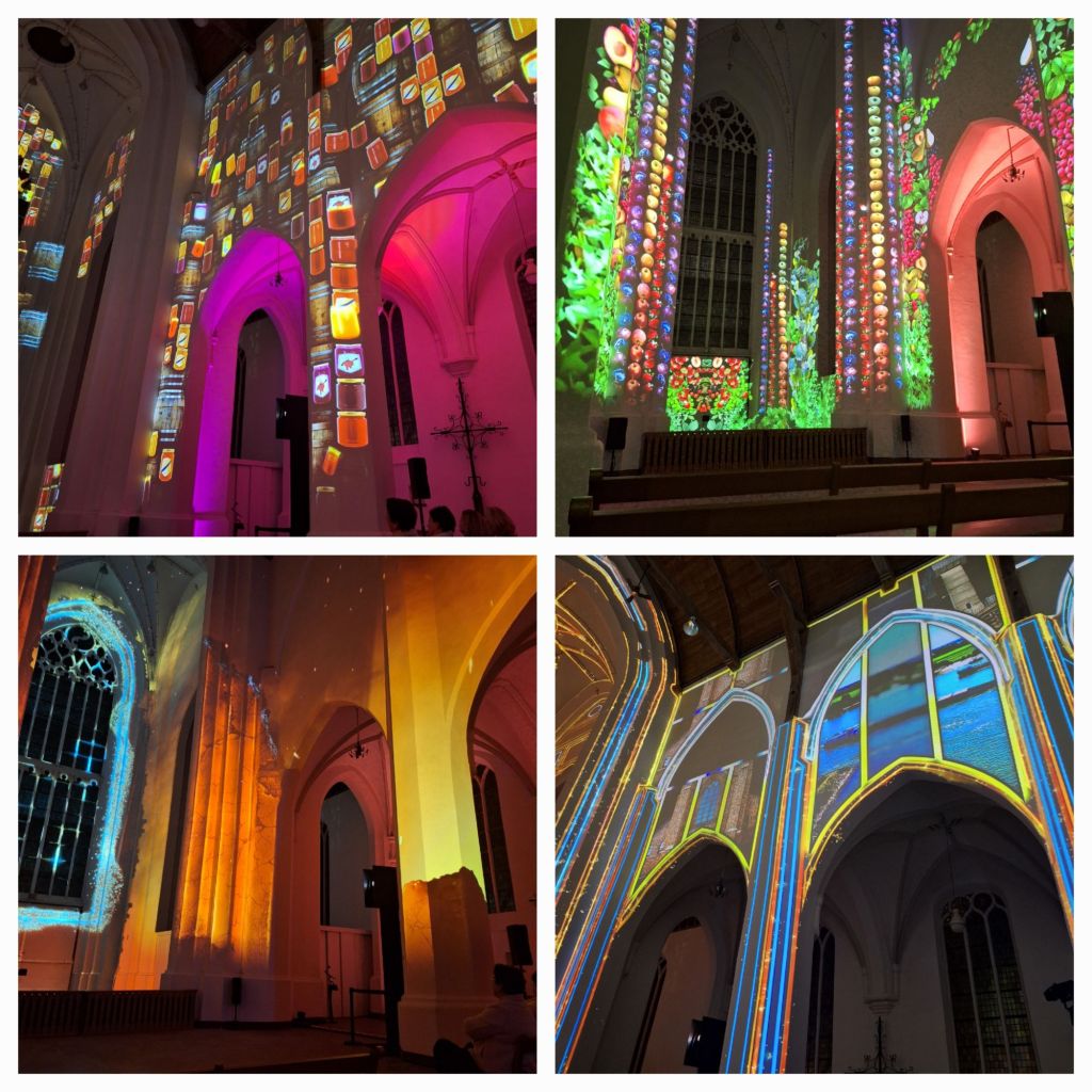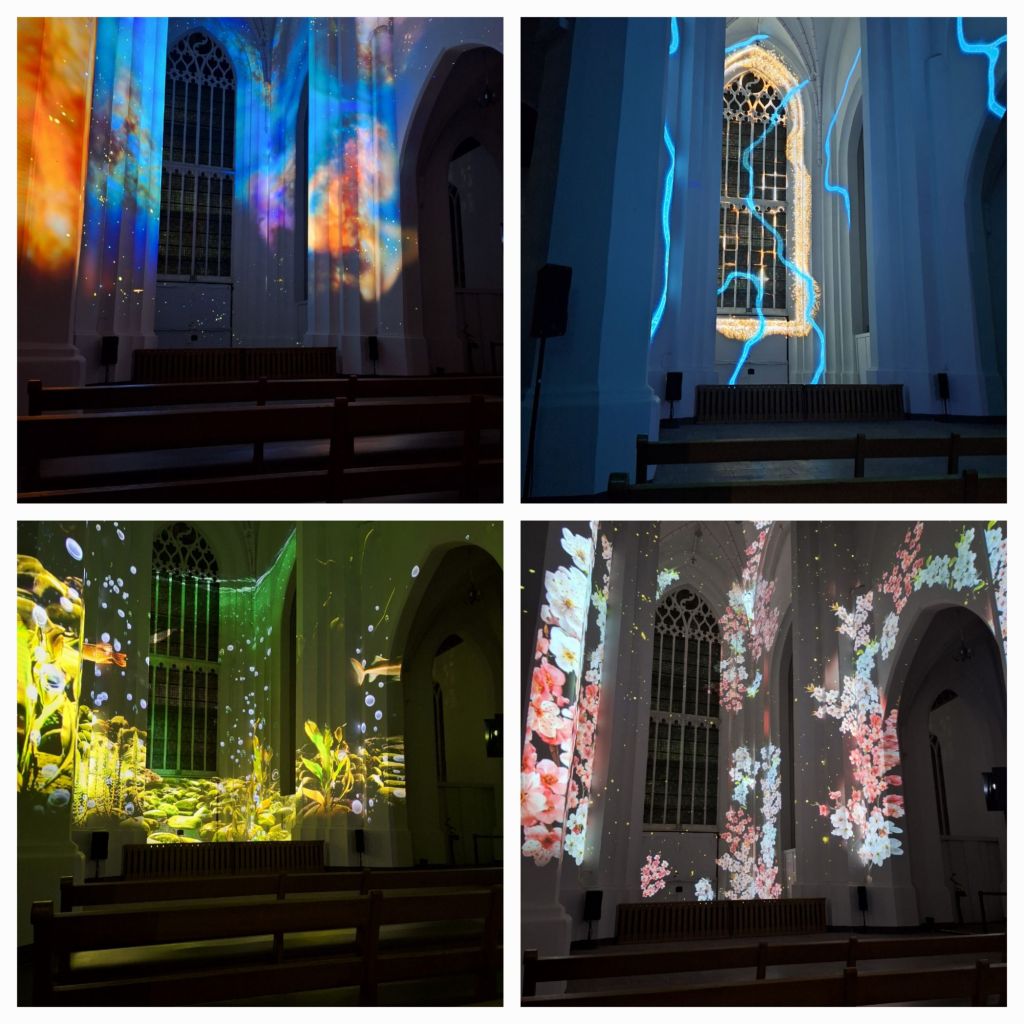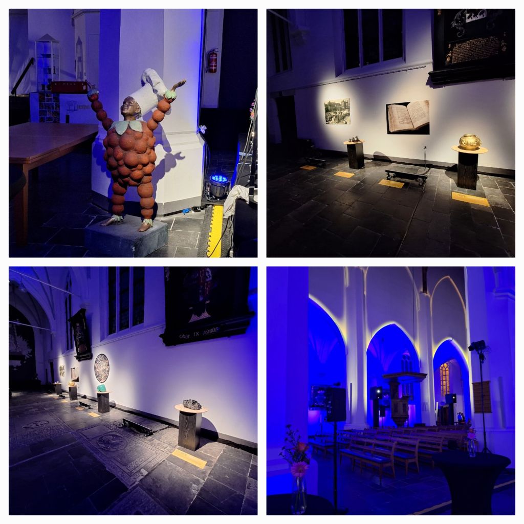 De kerk is vanbinnen gehuld in een blauw licht. Overal staan projectoren en lampen. Middenin staan de losse banken en ik zoek een plekje vooraan. Maar in de zuidbeuk staan voorwerpen uitgestald. Nieuwsgierig Aagje gaat natuurlijk kijken.
