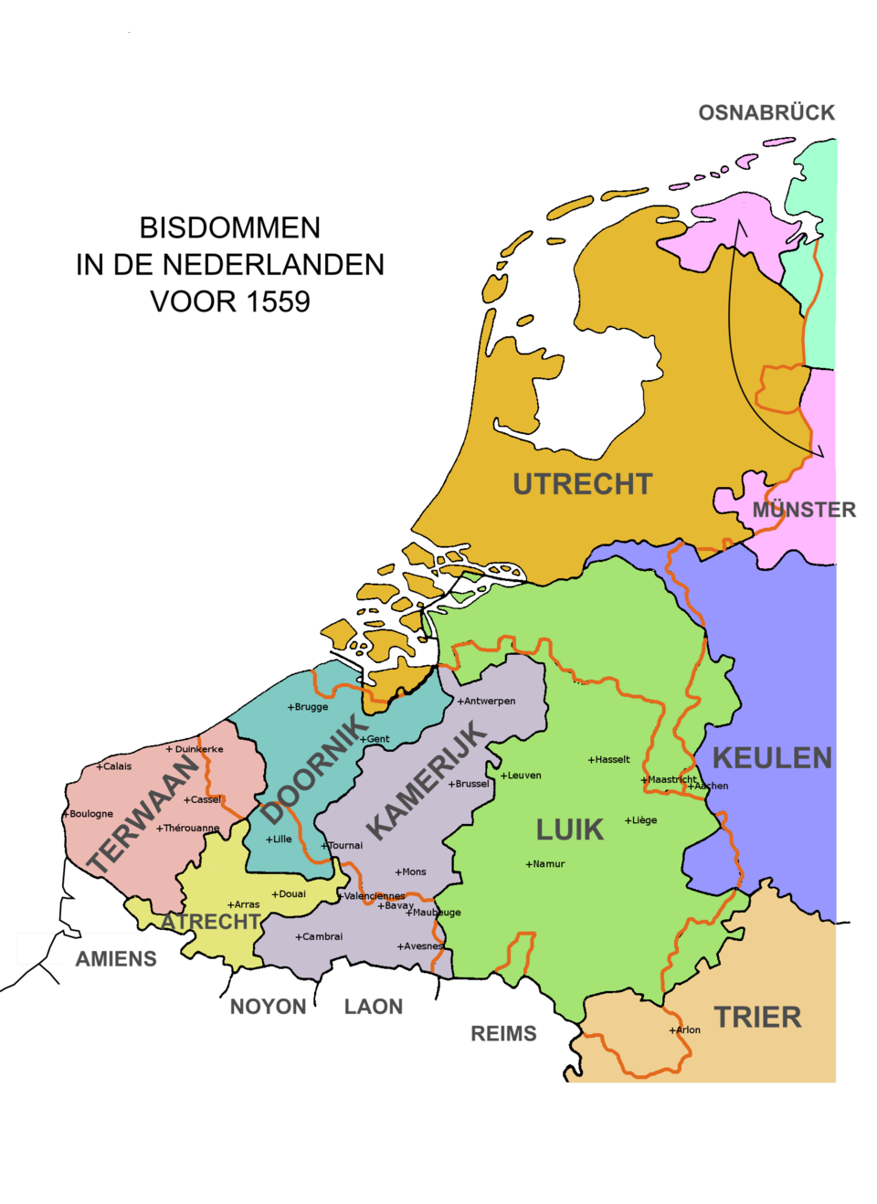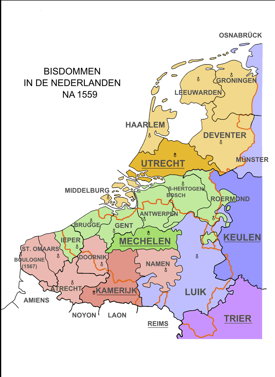 In 1559 waren de bisdommen grondig herzien. In plaats van zes grote onoverzienbare bisdommen waren er nu drie aartsbisdommen die samen 15 bisdommen omvatten. Doel was tweeledig: meer controle vanuit de vorst(en) op de kerk, meer controle vanuit de kerk op de gelovigen. Niet iedereen was hier blij mee.
