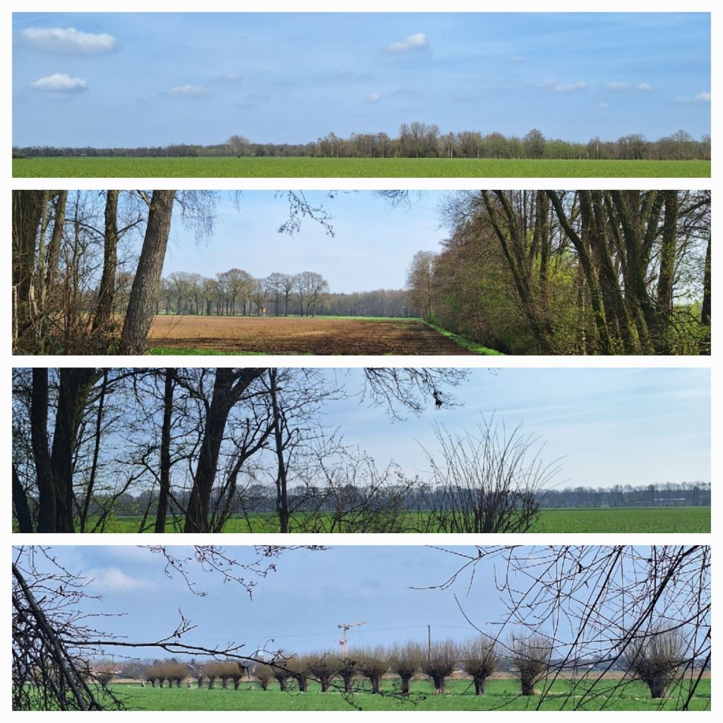 Ik loop vanaf de ‘bergen’ een ontzettend vlak landbouwgebied in. Grote akkers, lange rechte wegen, overal zijn de boeren bezig op de akkers en ik hoor zo nu en het geraas van vliegtuigmotoren. Ik loop nu vlakbij vliegveld Weeze.