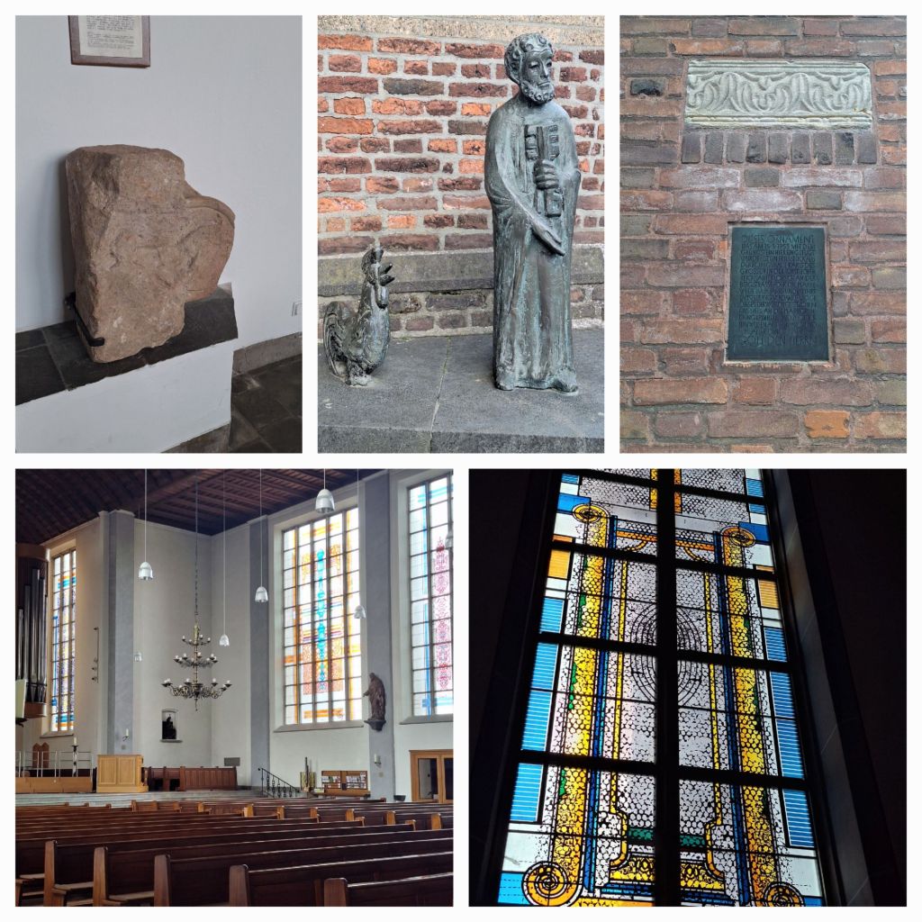 Op het marktplein loop ik eerst naar de Cyriakuskerk. De 15e eeuwse gotische kerk werd (net als een groot deel van het dorp) zwaar beschadigd. In 1953-1955 werd de nieuwe kerk gebouwd, waarin het laatgotische koor en de beide transeptsluitingen werden opgenomen. Dat levert een heel bijzonder gebouw op. Uit de oude kerk zijn nog diverse beelden en een altaar bewaard gebleven.