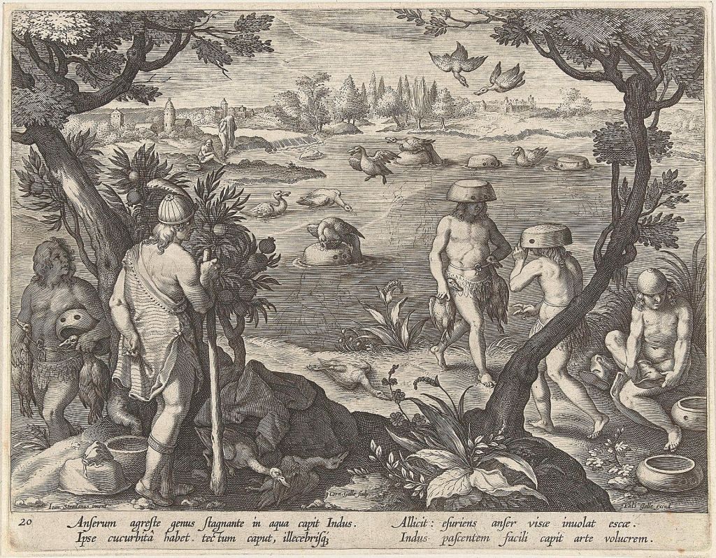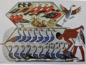 Er is een geweldig mooie afbeelding uit Egypte in de Oudheid van het vangen van eenden. Ook in die tijd wist men een eendenbout te waarderen, blijkbaar. In de ‘Nieuwe Wereld’ werden ook eenden gevangen. De inheemse bevolking deed dat als volgt: gecamoufleerd ging men te water met een uitgeholde pompoen over het hoofd. De eend ging op de pompoen zitten en was zo gemakkelijk te vangen.