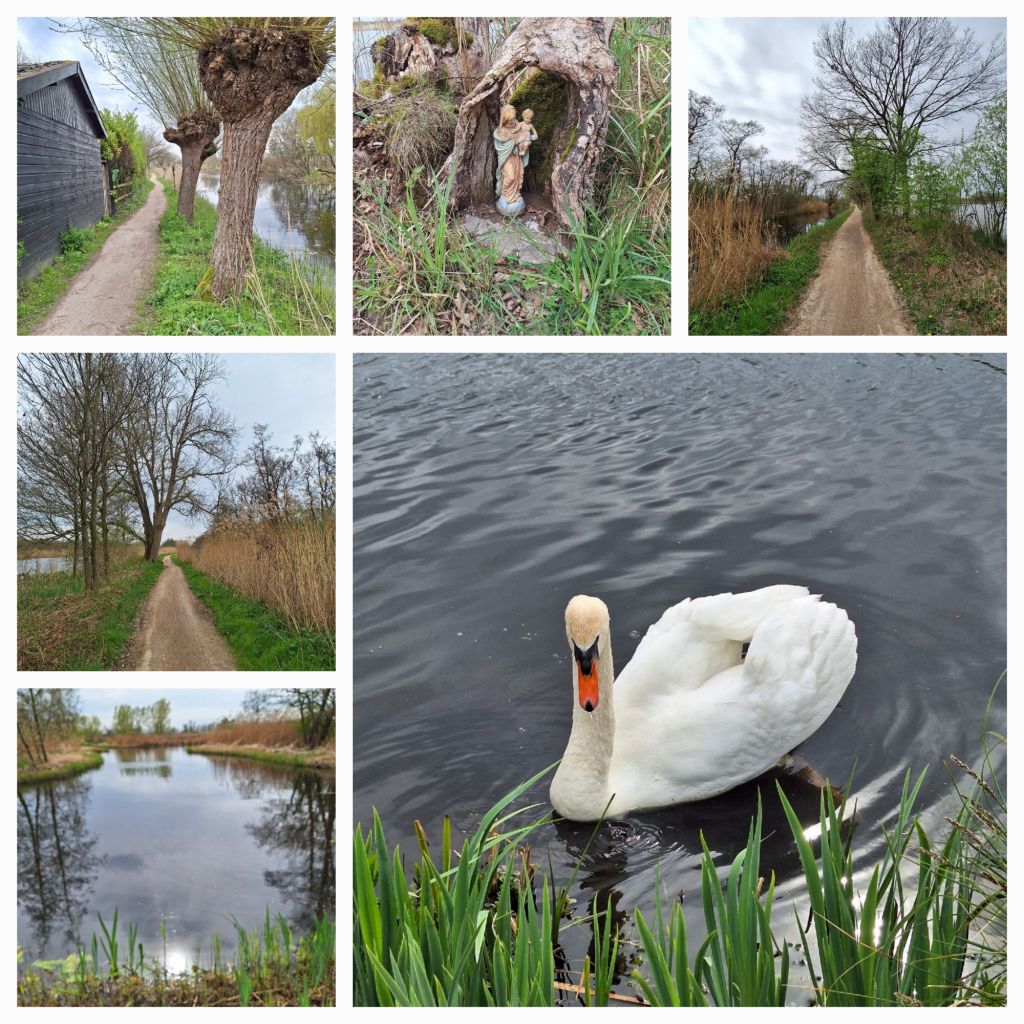 Over een smalle kade lopen we door de Ankeveense plassen op het dorpje Ankeveen aan. We nemen even pauze op een bankje bij de gele brug als een grote zwaan log waggelend naar het water loopt, waar hij sierlijk rondzwemt. Als we verder wandelen, komt-ie snel achter ons aanzwemmen en we vermoeden een nest. Ja hoor, na een tiental meters zien we links een zwaan op het nest zitten.