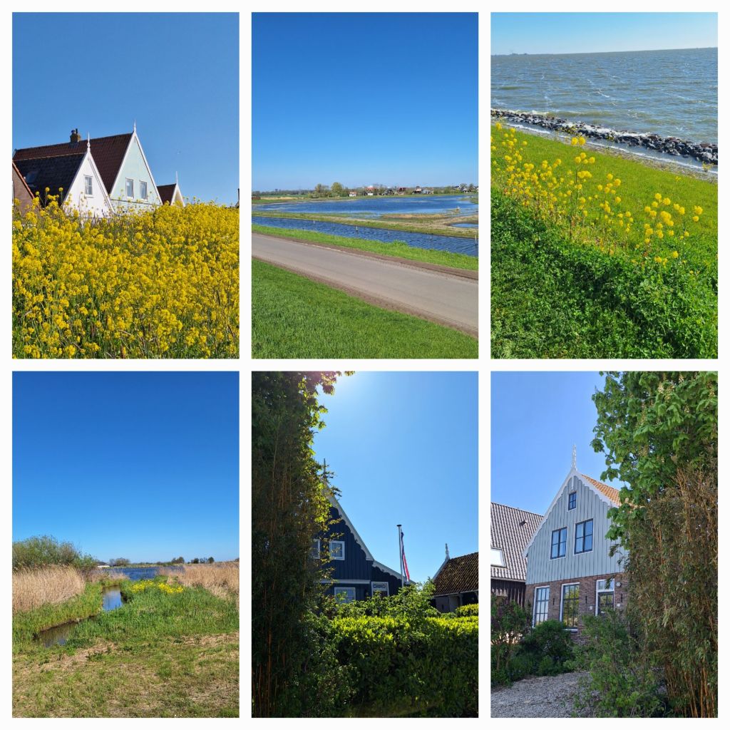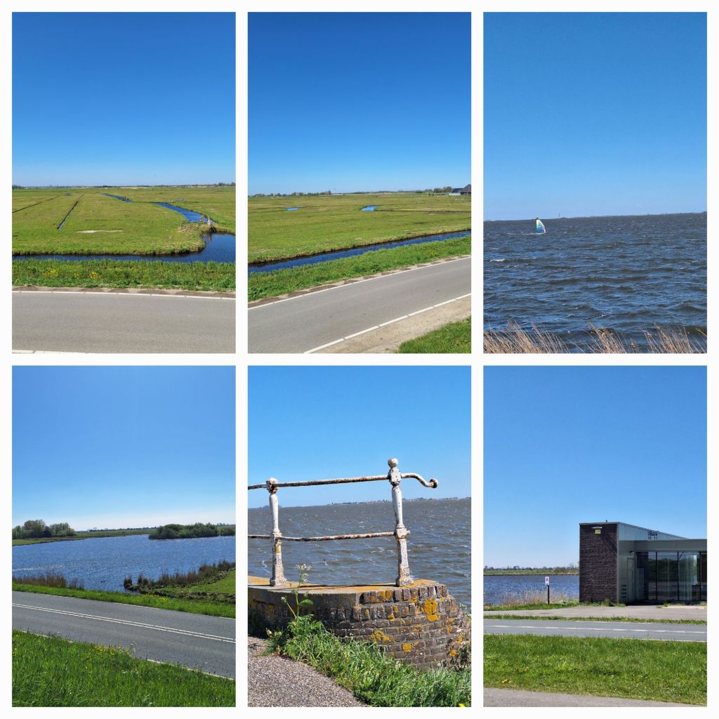 Bij de dijk naar Marken ga ik richting het westen. Op de Gouwzee flitsen de zeilen van de surfers in het zonlicht. Er staat windkracht vier en daar zijn die surfers erg blij mee, denk ik.