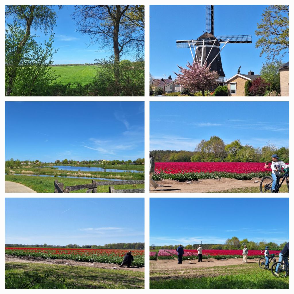 In het oude brinkdorp Rheeze ligt de weg open. Ik sjouw met mijn fiets door het mulle zand en dan op naar Mainbarg. Bij Diffelen zie ik mensen aan de kant van de weg staan met fietsen en auto’s. Wat blijkt? Ook hier worden bloembollen geteeld!